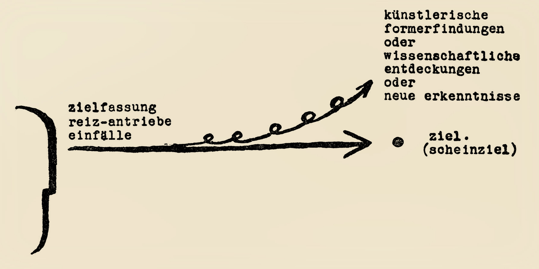 Der interessanteste Ansatz hierzu ist die These vom „schöpferischen Winkel“. Baumeister zufolge waren die Dinge, die Künstler als ihre Ziele formulierten, nur Scheinziele – allenfalls Reize auf dem Weg ins Unbekannte, durch die sie (die Künstler) schließlich zu ihrem eigentlichen – nicht vorhersehbaren und nicht planbaren – künstlerischen Ergebnis gelangten. In der ihm eigenen Klarheit visualisierte Baumeister dies anhand einer knappen Skizze.