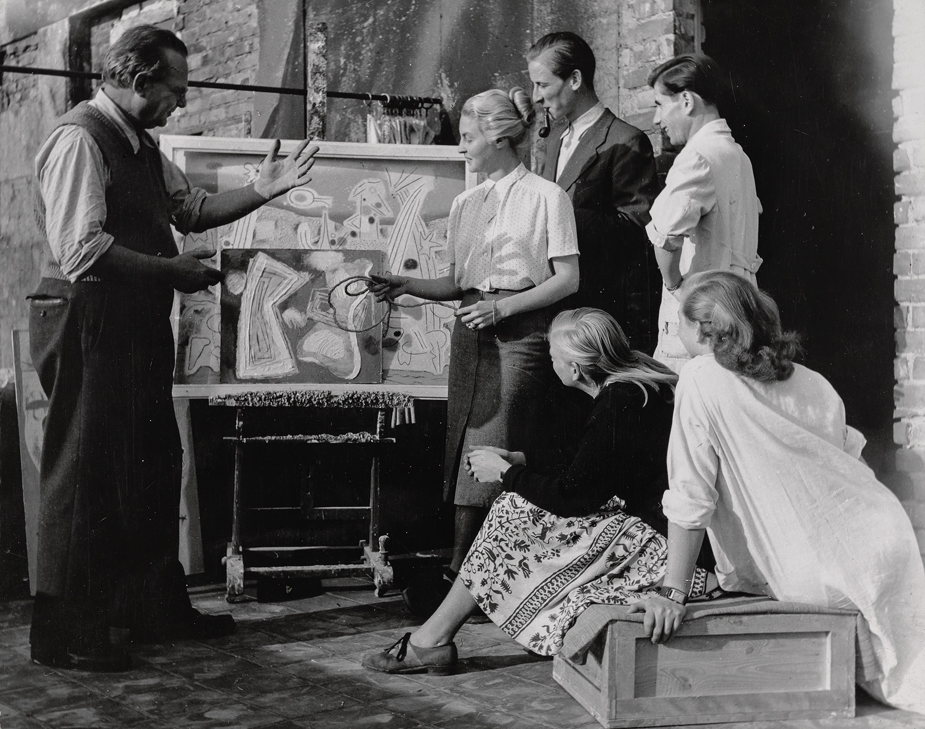 Willi Baumeister arbeitete mit uns, wir mit ihm, im kleinen Kreis. Als ich im Januar 1947 hinzukam, war das ihm zugestandene Schüler-Kontingent … bereits erreicht. Ich wurde als Privatschülerin aufgenommen, weil ich nicht nur sechs Semester an der hitlerisch ausgerichteten Kunsthochschule in Dresden hinter mir hatte. Wenn die Akademie nicht geheizt war, fand der Unterricht in meiner Bude statt oder in meinem Zimmer, das Karin Schlemmer mit Mutter und Schwester bewohnte oder im Atelier seines Hauses – später vor allem in der Ruine. Das Arbeiten im kleinen Kreis ergab ein kollegiales Miteinander. Korrigieren bestand im Findenlassen, Geltenlassen, Lehren und Leeren sei wie Ein- und Ausatmen. Ein fließendes Ineinander von Lehren, Lernen und Tun. Vergabe von kleinen Aufträgen. Gemeinsame Unternehmungen.