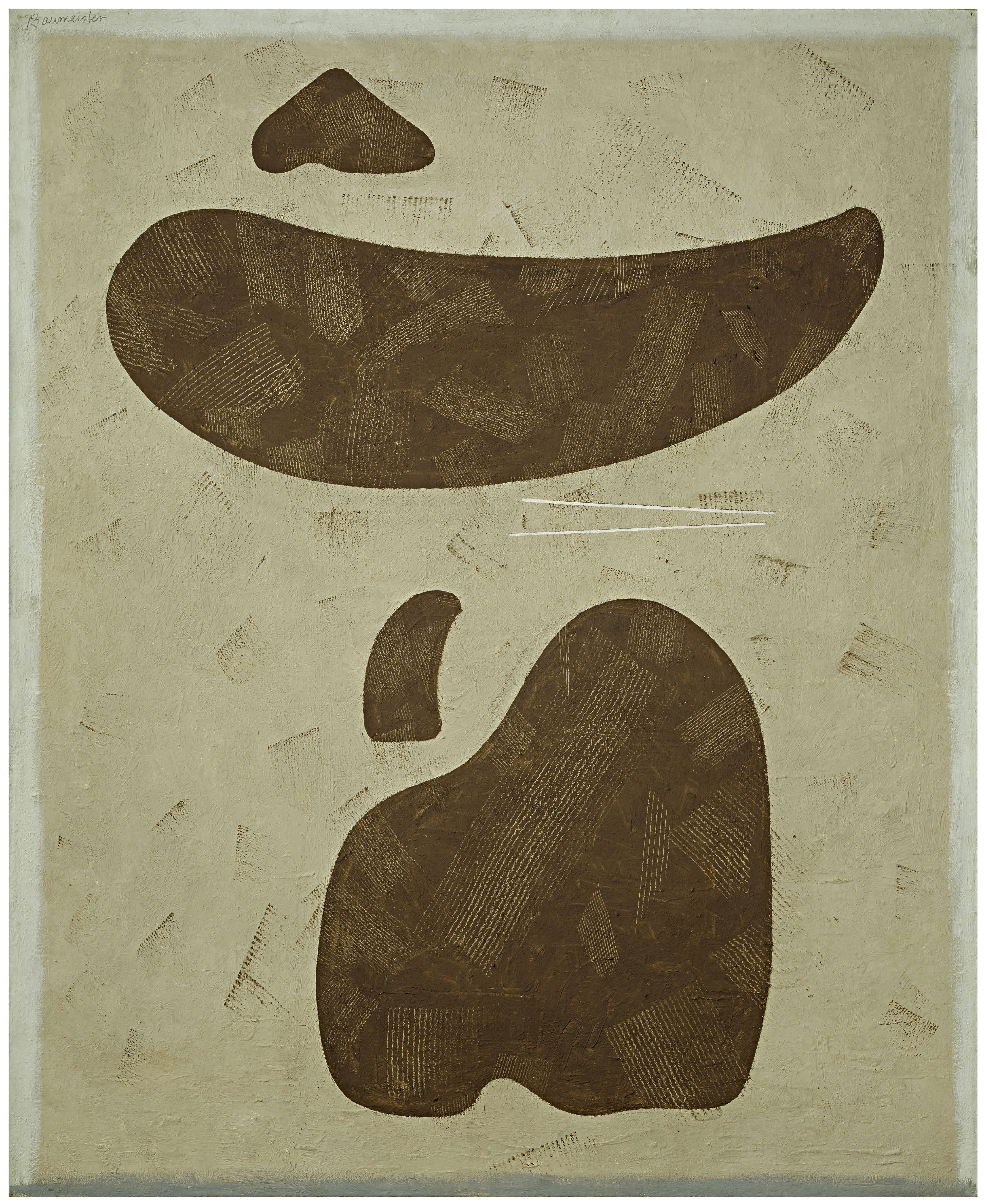 Nun reduzierte er jedoch die Bezüge zur menschlichen Figur immer mehr zu einem freien Spiel der Farben und Flächen. Amöbengleiche Formgebilde scheinen über die Oberfläche zu schwimmen. Sie behaupten sich klar gegen die benachbarten Elemente, begeben sich aber dennoch mit ihnen in einen Dialog, geben ihnen Raum und dringen ihrerseits in freie Räume vor. „Maske 4“ ist ein prägnantes Beispiel für Baumeisters hohes Abstraktionsvermögen, denn es handelt sich um Maske und Figur gleichermaßen. So menschenfern sich die Komposition auf den ersten Blick gibt, so kann man doch allmählich Gliedmaßen, Augen und ähnliches erahnen. Die außerordentliche Zeichenhaftigkeit dieser Arbeiten gibt Interpretationen nach mehreren Richtungen Platz.