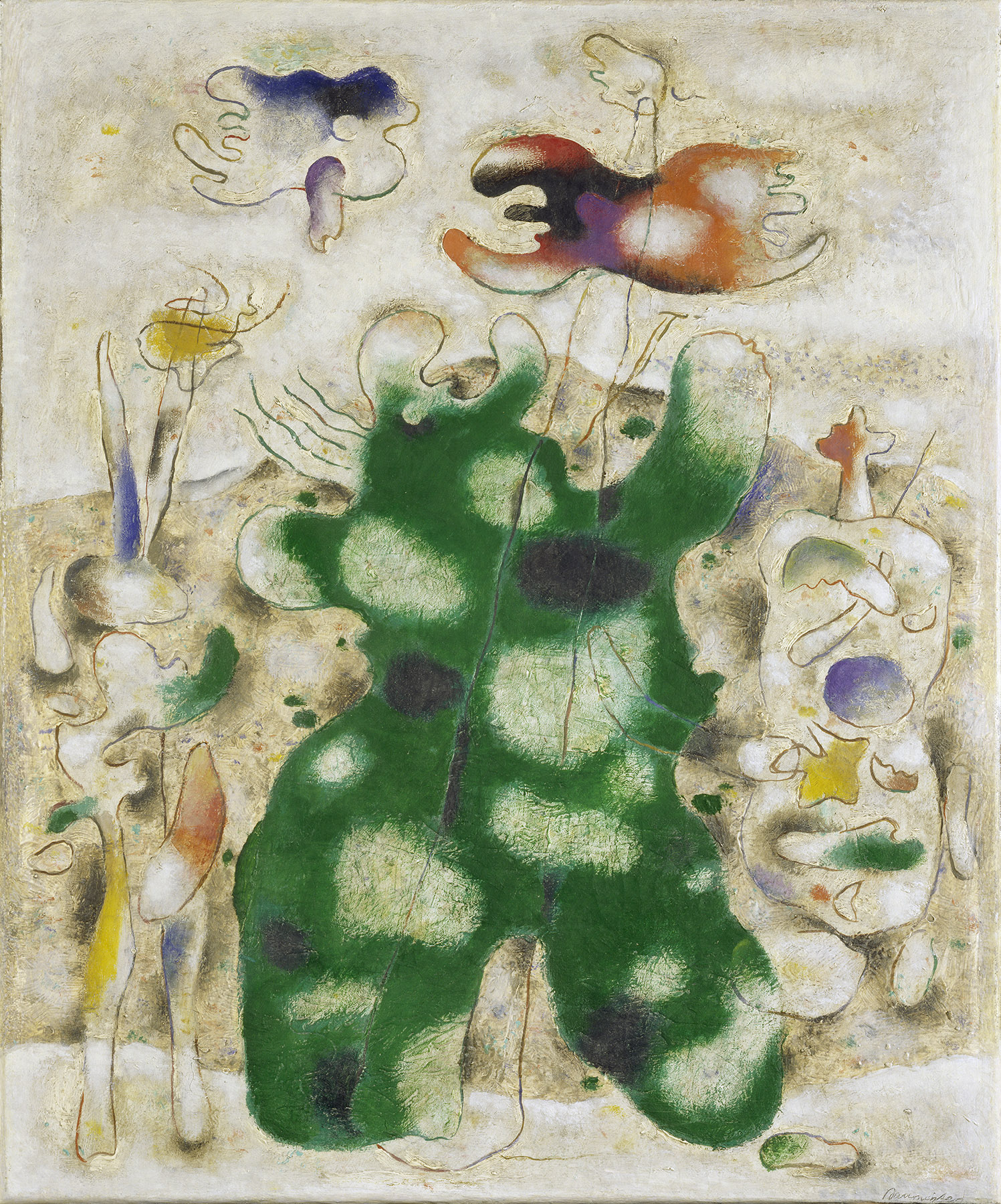 Bei näherer Betrachtung sieht man eine Verbindung zu den „Läufern“ von 1934: Kopf, Arme, Taille, und die ausgreifende Schrittbewegung sind auch beim „Ideogramm“ von 1936 erkennbar. Dieses Gemälde hat damit gewissermaßen noch eine menschliche Dimension, während „Schwebende Formen mit Weiß“ (1938) zur reinen Form geworden ist. Auch das „Ideogramm“ von 1938 ist an die Grenze zum Ungegenständlichen gerückt, während „Tori“ (1938) formal dazwischen steht.