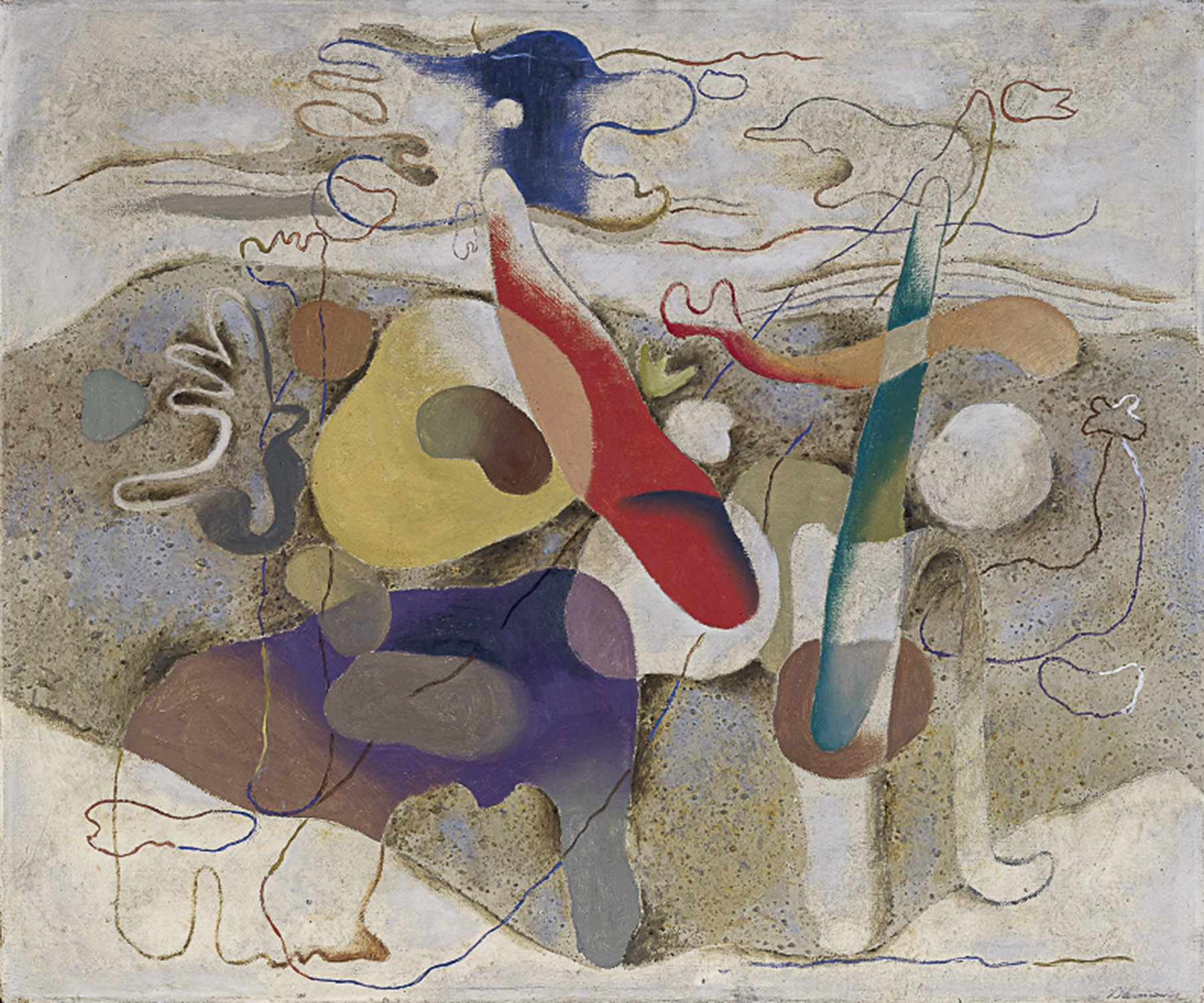 Labyrinthisch verworrene Knäuel geben jeder Arbeit einen individuellen Charakter. Stets sieht man eine Art Figur aus kurvigen Flächen und Linien, die entfernt an menschliche Gestalten erinnert, aber wie ein Geist über der Erde schwebt. Es handelt sich um mythische Szenerien in einer Fantasiewelt, die an die Ursprünge der Welt anspielen. Die Figuren erwachsen gleichsam aus Erde, Samen, Lava, Stein und Wind – losgelöst von jedem Bezug zur realen Welt und doch in ihrer spielerisch-heiteren Leichtigkeit irgendwie vertraut. Einzelne Elemente der „Eidos“-Bilder lassen sich auch in anderen Arbeiten dieser Phase finden (siehe „Figur in Bewegung“, 1936 – „Mit dunklen Formen“ 1938), wurden aber in eine neue Idee eingebunden.
