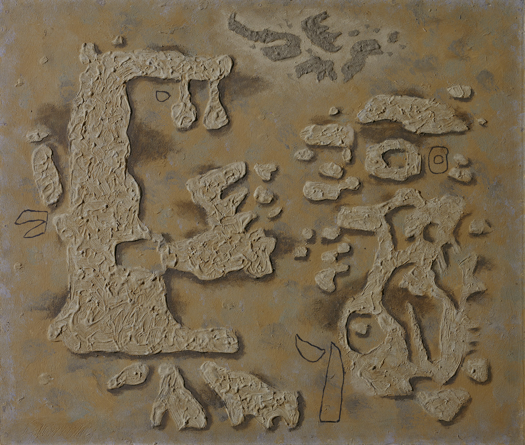 Der stark reliefartige Aufbau jener Jahre hingegen war nun größtenteils einer leichteren und flächigeren Konzeption gewichen. Neben „Belebte Halde“ ist dies auch an einigen „Harfen“ zu sehen. In ihnen variierte Baumeister das Thema der „Fels“- und „Ritzzeichnungen“, das ihn seit etwa 1930 beschäftigte. Es ließen sich zahlreiche weitere Beispiele für diese Rückbesinnung finden. In ihnen drückt sich keine Rückwärtsgewandtheit aus, sondern der kontinuierliche Wandel in Baumeisters Werk.