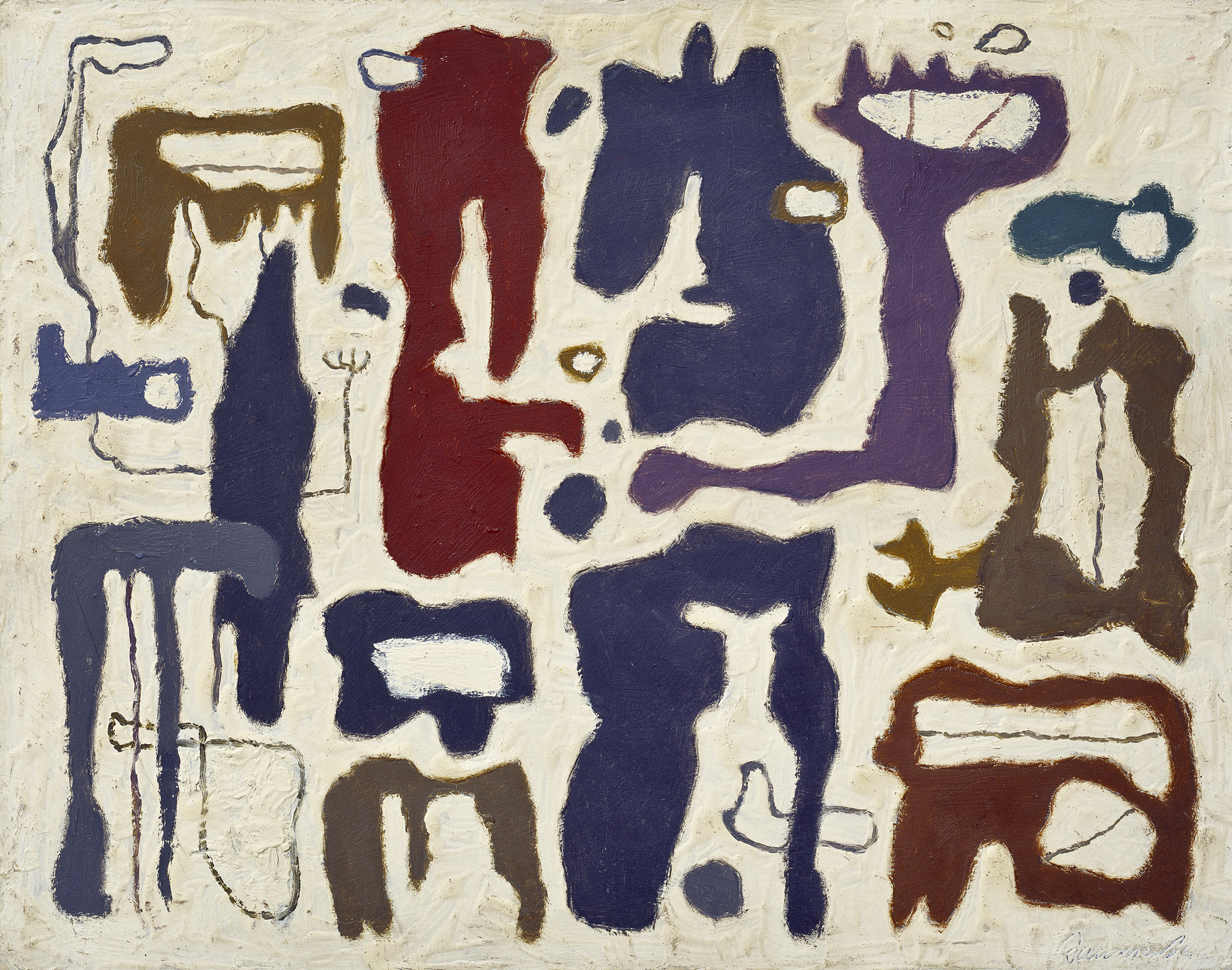 Eindeutige Bildinhalte hatten ohnehin nie Baumeisters Vorstellung entsprochen und taten es in dieser Phase umso weniger. Auch in mehreren Arbeiten, die er „Perforationen“ nannte, finden wir braune oder blaugraue Formen, die positiv wie negativ zu lesen sind. Relief und Perforation sind im Grunde zwei unterschiedliche Herangehensweisen an dasselbe Thema. Bezeichnend für die Mehrdimensionalität dieser Phase ist der Titel „Noch nicht entziffert“ für ein weiteres Gemälde von 1942.
