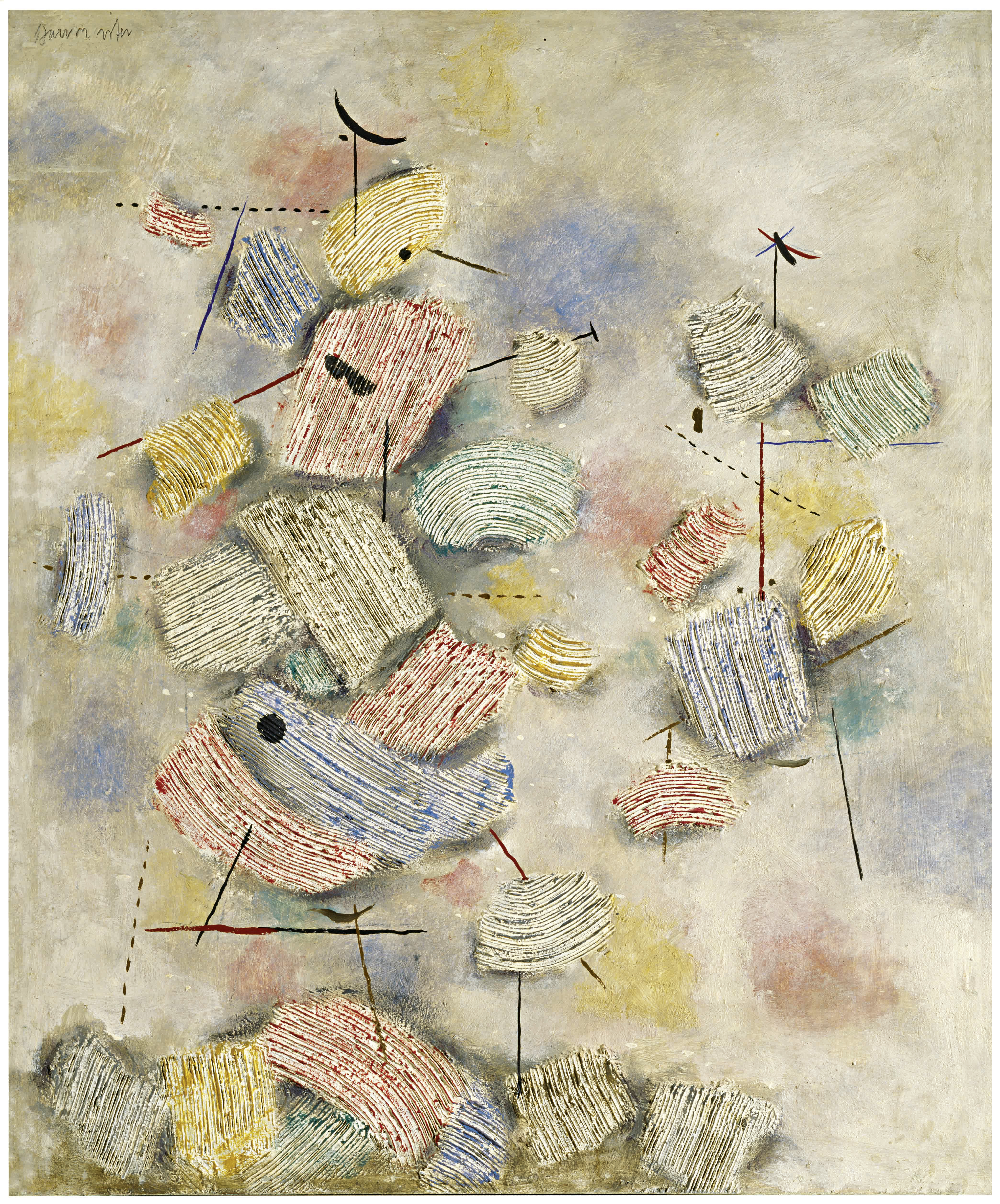 Das einer archaischen Schrift gleichende Gemälde „Erinnerungsrest“ (1944) ist ähnlich reliefartig konzipiert wie „Jura“ und „Gilgamesch“, aber stärker in Richtung Linienzeichnung reduziert. Dadurch wirkt es – ähnlich wie die „Streifenkomposition auf Lila“ aus demselben Jahr – leichter und weniger bedrohlich. Dies charakterisiert noch weitere Arbeiten von 1944, wie beispielsweise die „Sonnenfiguren“, die in ihrer hellen Heiterkeit wie eine Vorahnung oder gar Beschwörung des Kriegsendes und damit der Erlösung gelesen werden können.