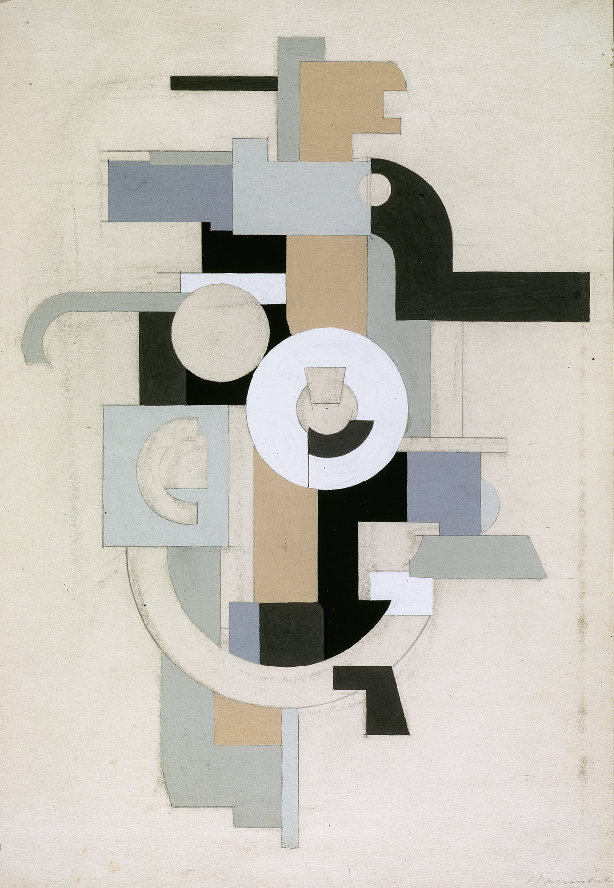 Kohleskizze, Bleistift, unter Verwendung von Zirkel und Lineal, Deckfarbe in Schwarz, Weiß, Grau, Ocker, Graugrün, auf chamoisfarbigem Zeichenkarton
