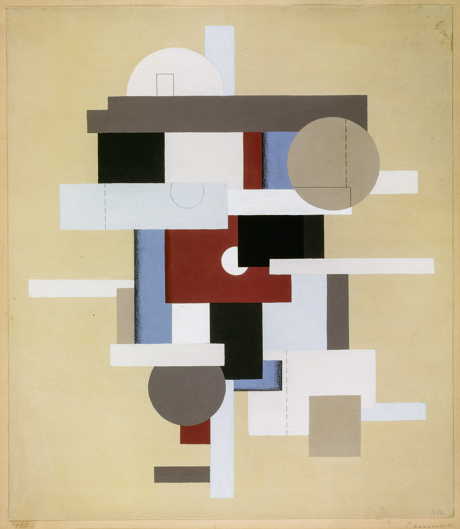 Bleistift, unter Verwendung von Zirkel und Lineal, Deckfarbe in Weiß, Hellblau, Rot, Grau, Schwarz, Hellbraun, Ocker, auf chamoisfarbigem Zeichenkarton, auf starken Unterlagekarton aufgezogen