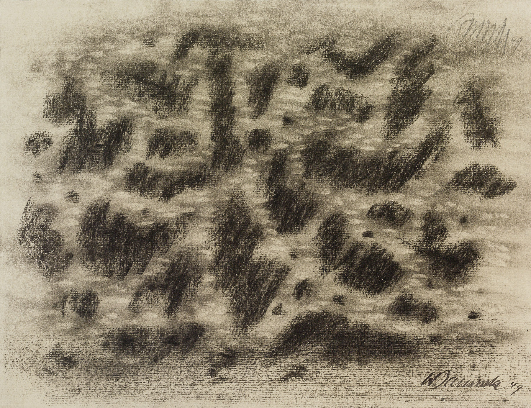 Kohle, gewischt, radiert, fixiert, auf hellbeigefarbigem Ingres-Bütten mit Wz. r. o.: PMF (ITALIA)