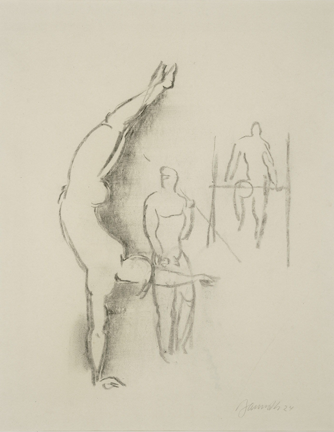 Kohle, Deckfarbe in Ocker, Braun und Grau, fixiert auf chamoisfarbigen Aquarellpapier