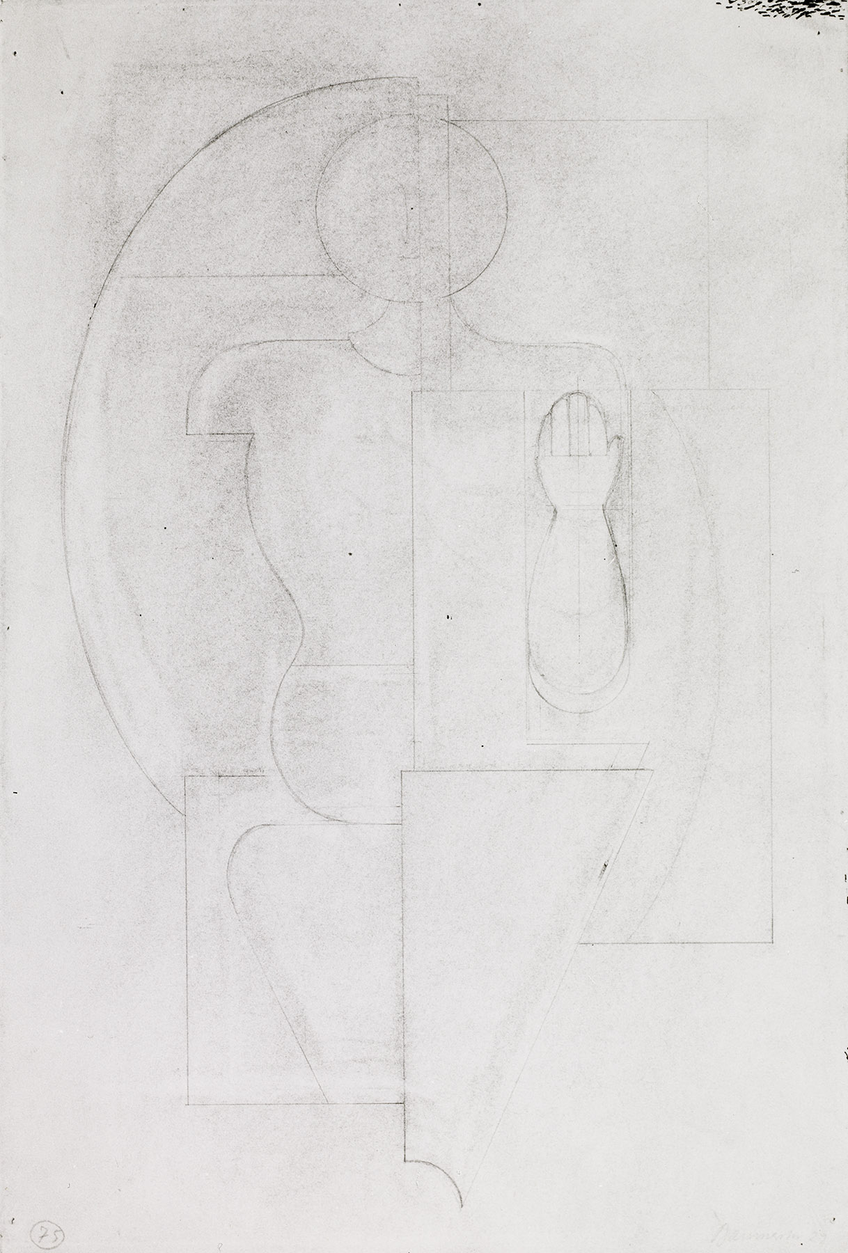 Dieses Blatt ist als ein Entwurf für die „Apoll“-Komposition anzusehen. Apoll steht hier für die Idealgestalt des Menschen. Die Schönheit seiner Figur wird mit den Mitteln der konstruktivistischen Formulierung und Interpretation vergegenwärtigt. Auf der Zeichnung sind vielfältige Pentimenti und Varianten in Vorzeichnung zu erkennen. Ritzkonturen sind mit Lineal und Zirkel nachgezogen. Sie sind nicht nur Zeugnis der Verwendung und Übertragung der Komposition von diesem auf andere Blätter oder umgekehrt; sie dienen - vor allem in den weiteren 20er und den 30er Jahren - dazu, auch auf dem Papier eine Art von Relief herzustellen, wie B. es mit dem Mittel der plastisch aufgetragenen Farbe bei den Gemälden der 20er Jahre praktiziert hat. Bis auf Kleinigkeiten stimmt dieses Blatt vollkommen mit der Lithographie Sp 73 überein. Ebenso zu vergleichen sind Sp 74 und G 183, die eine Variante zeigen.