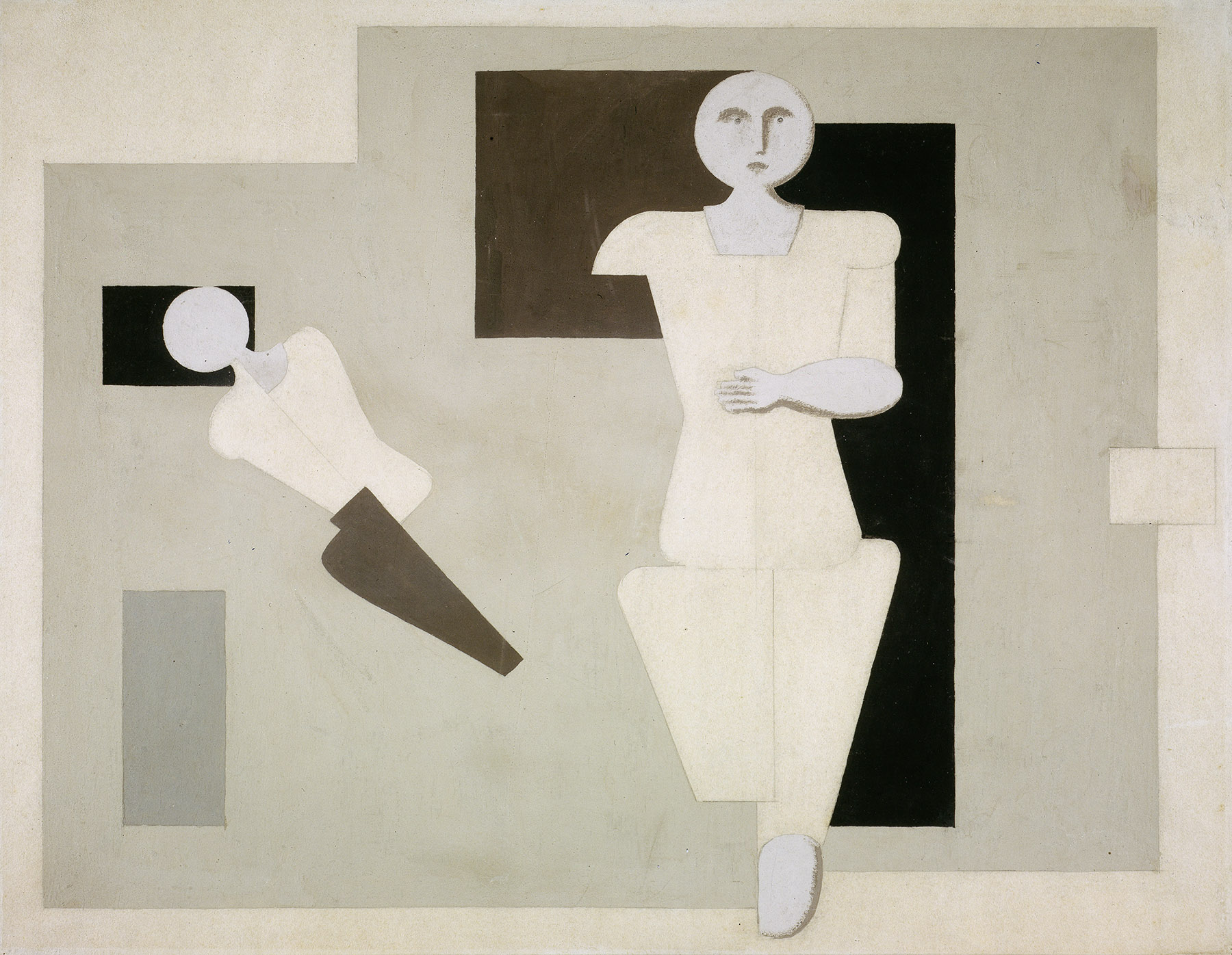Aus der senkrecht stehenden Figur des Apoll wird über eine Erweiterung in Form des Halbkreises, wie in den beiden vorausgehenden Nummern, eine querformatige Komposition gefunden: Hier mit dem Motiv der schrägstehenden Figur als Variation der aufrechten Figur. - Vgl. das vernichtete Gemälde G 179 von 1922 entfernt. (fkb)
