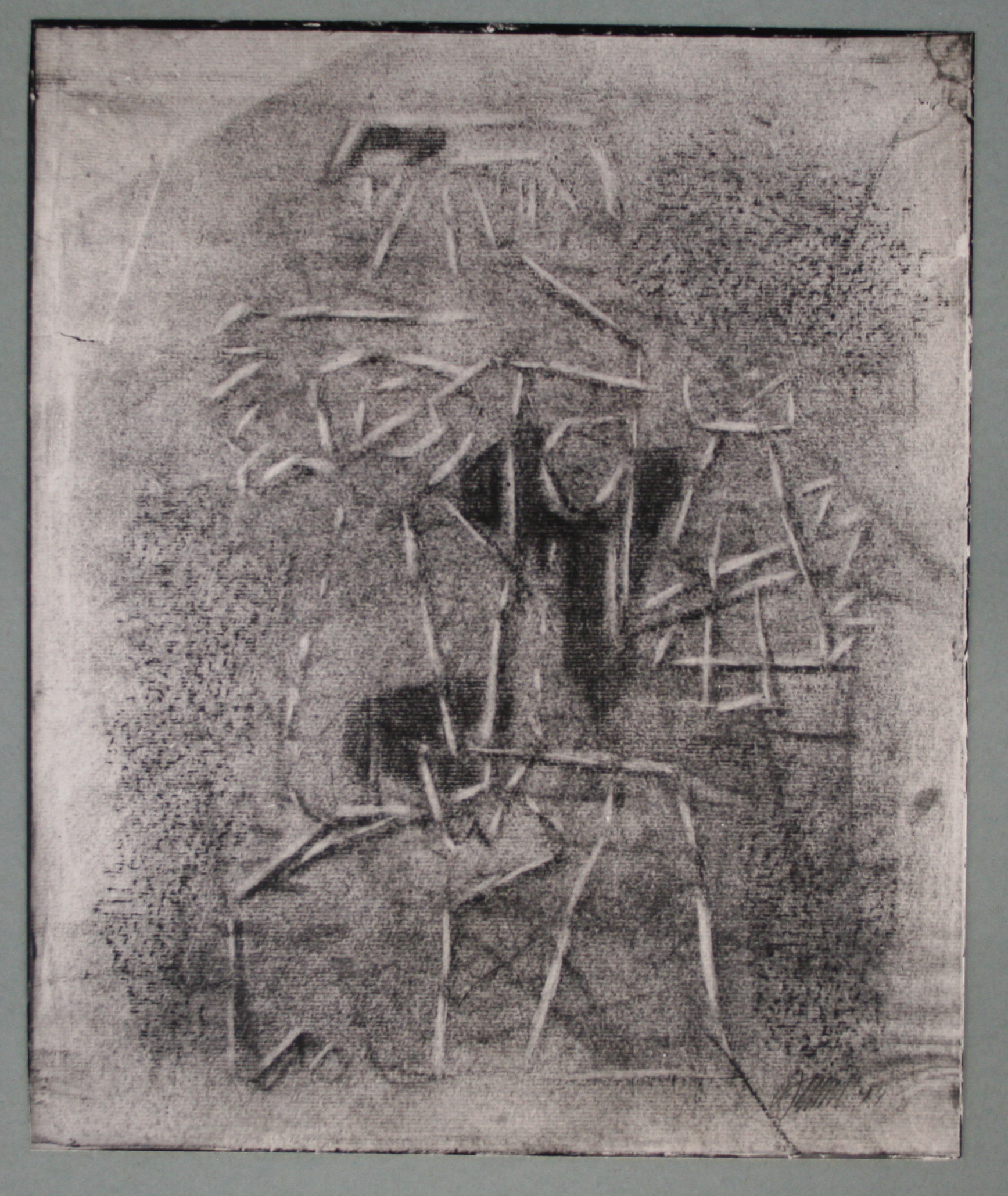 Kohle, gewischt, radiert, Ölkreide in Schwarz, durchgerieben, fixiert, auf braunem Ingres-Bütten