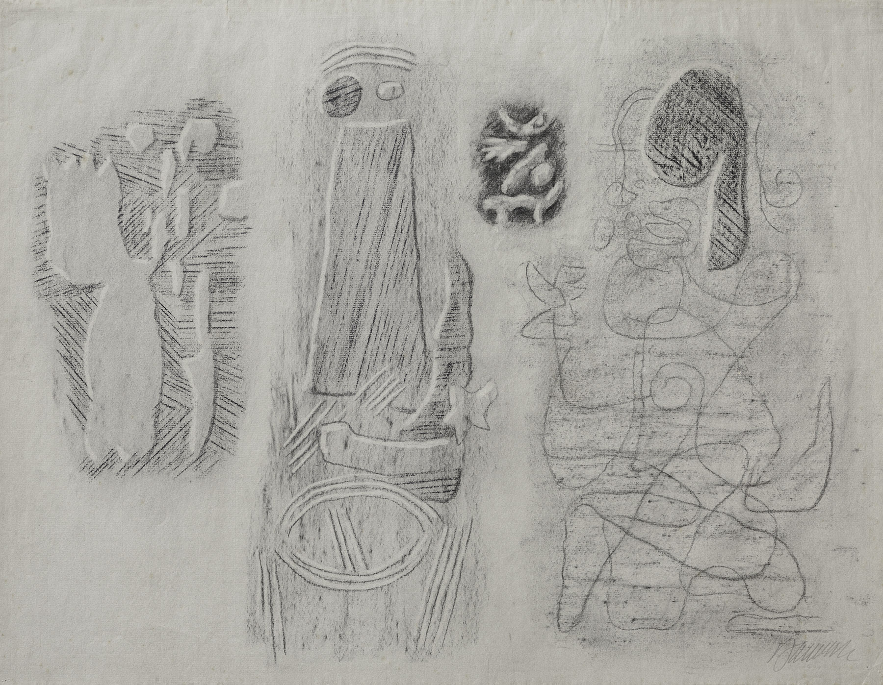 Kohle, gewischt, radiert, Ölkreide in Schwarz, durchgerieben, fixiert, auf grauem Ingres-Bütten