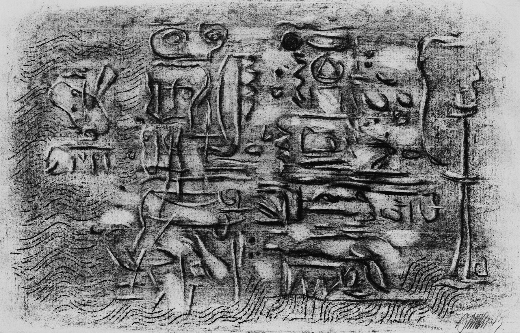 Kohle, gewischt, radiert, Ölkreide in Schwarz, durchgerieben, fixiert, auf Ingres-Bütten
