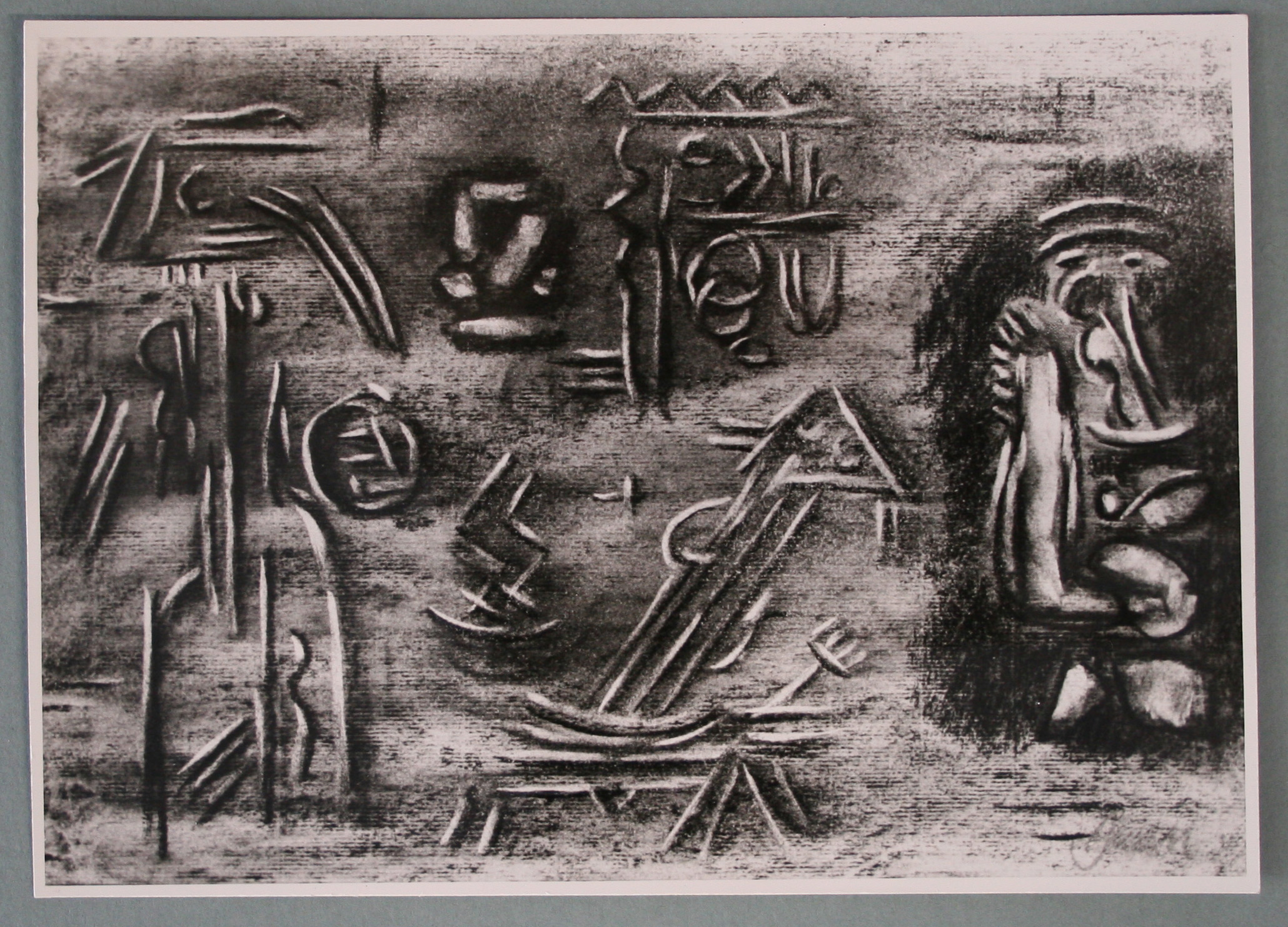 Kohle, gewischt, radiert, Deckweiß, fixiert, auf gelblichgrauem Ingres-Bütten mit Wz. l. u.: Hahn im Kreis