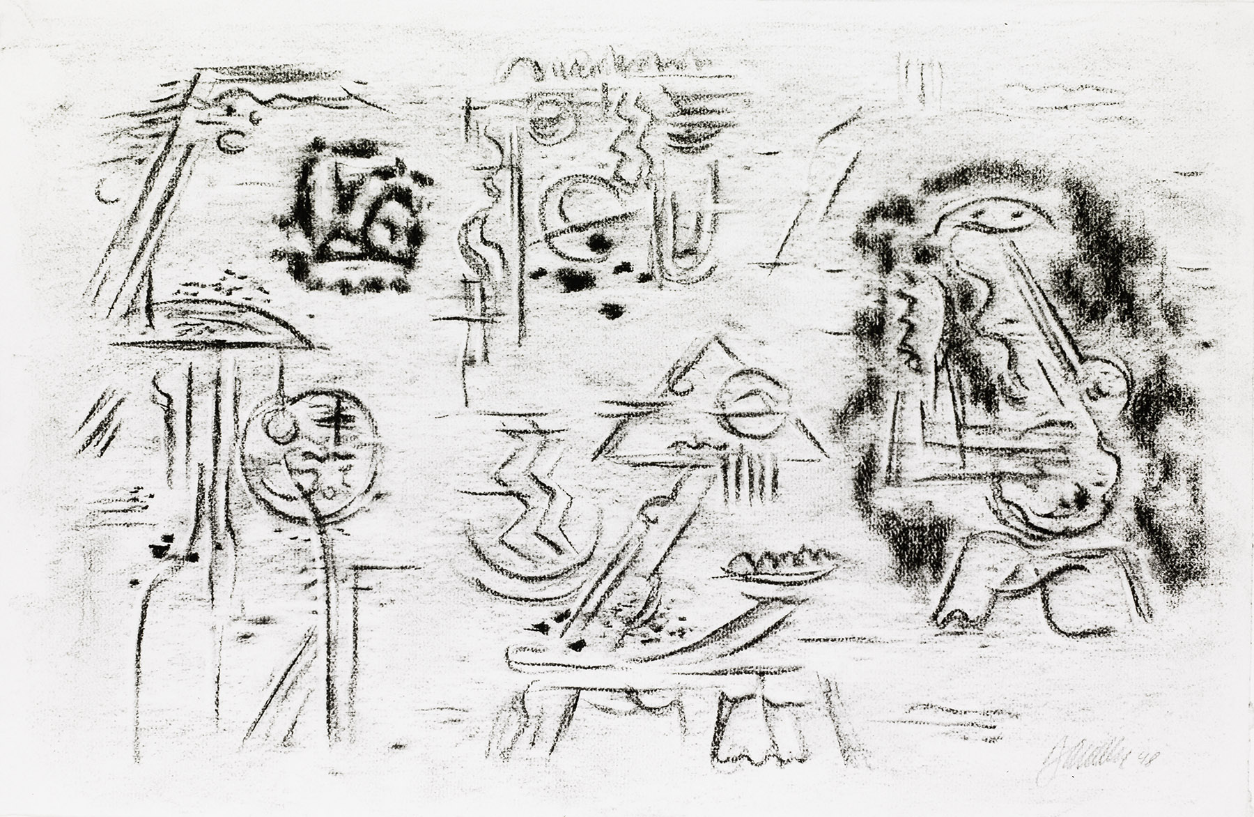 Kohle, gewischt, radiert, fixiert, auf chamoisfarbigem Ingres-Bütten mit Wz. r. u.: INGRES und l. o.: CANSON & MO