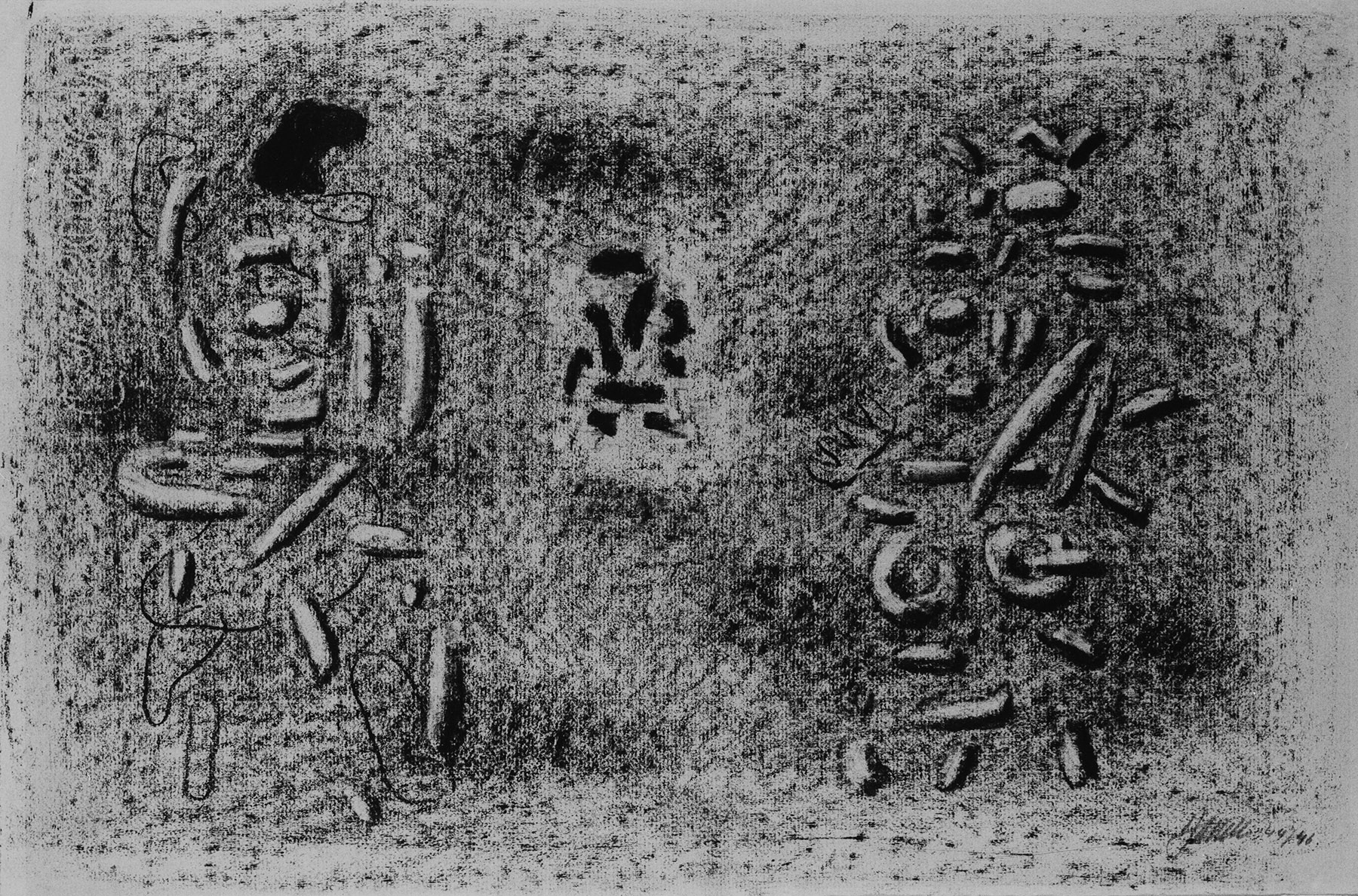 Kohle, gewischt, radiert, Ölkreide in Schwarz, fixiert, auf maisgelbem, am Rand o. im scharfen Knick abgetrenntem Ingres-Bütten mit Wz. r. u.: INGRES und l. o.: CANSON & MO