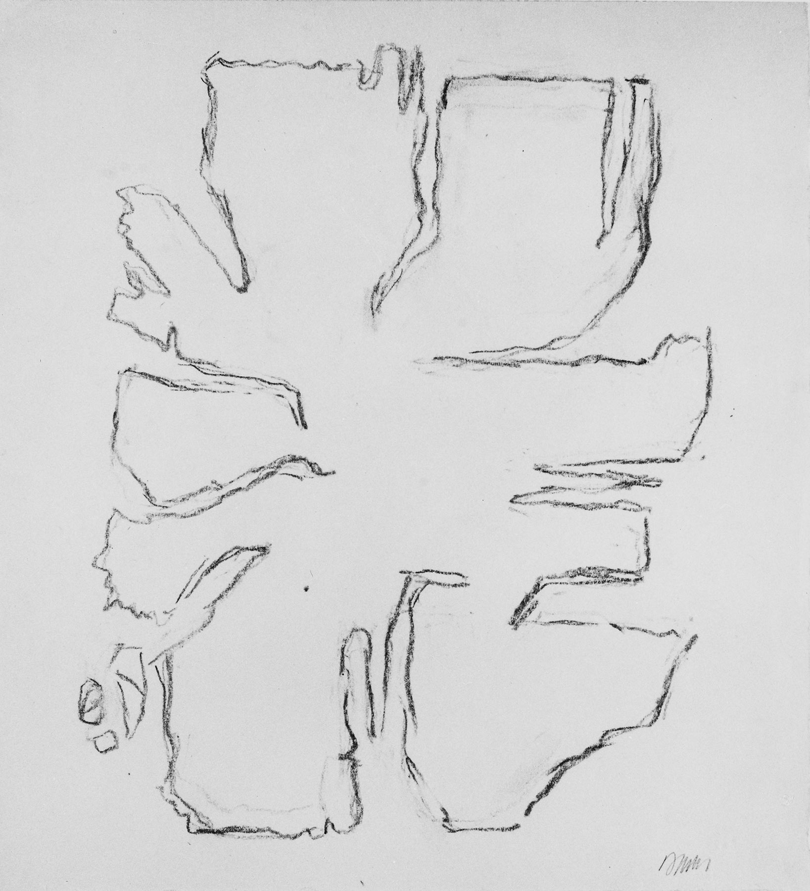 Kohle, fixiert, auf gelblichem, imitiertem, am Rand r., l. und u. z. T. unregelmäßig gerissenem Japanpapier