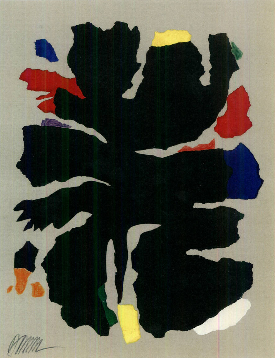 Pinsel in Ausziehtusche in Schwarz auf schwarzem Papier, gerissen, teilweise zackenartig geschnitten, Pastell in Rot, Grün, Violett, Orange, Dunkelblau, farbige Papiere gerissen, auf leichtem grauen Karton