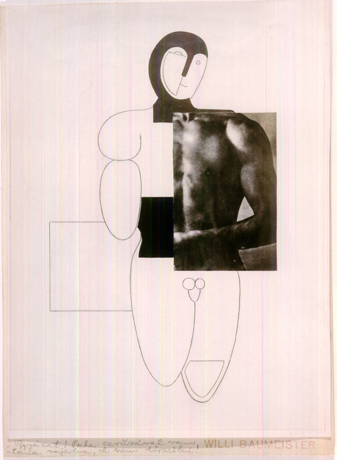 Collage auf einem weiteren Papier befestigt, auf diesem unten rechts Stempel: WILLI BAUMEISTER / links daneben nicht in der Schrift von Baumeister, ungarische Beschriftung: Vigyázat! Puha ceruával vam [vaw] utáua [utáva] rajzolva, el new dörzsöhni! / Vorsicht, wurde mit weichem Bleistift nachgezogen (überzeichnent). Nicht verschmieren! / Eventuell in einer Graphischen Sammlung in Budapest (Stand 2017).