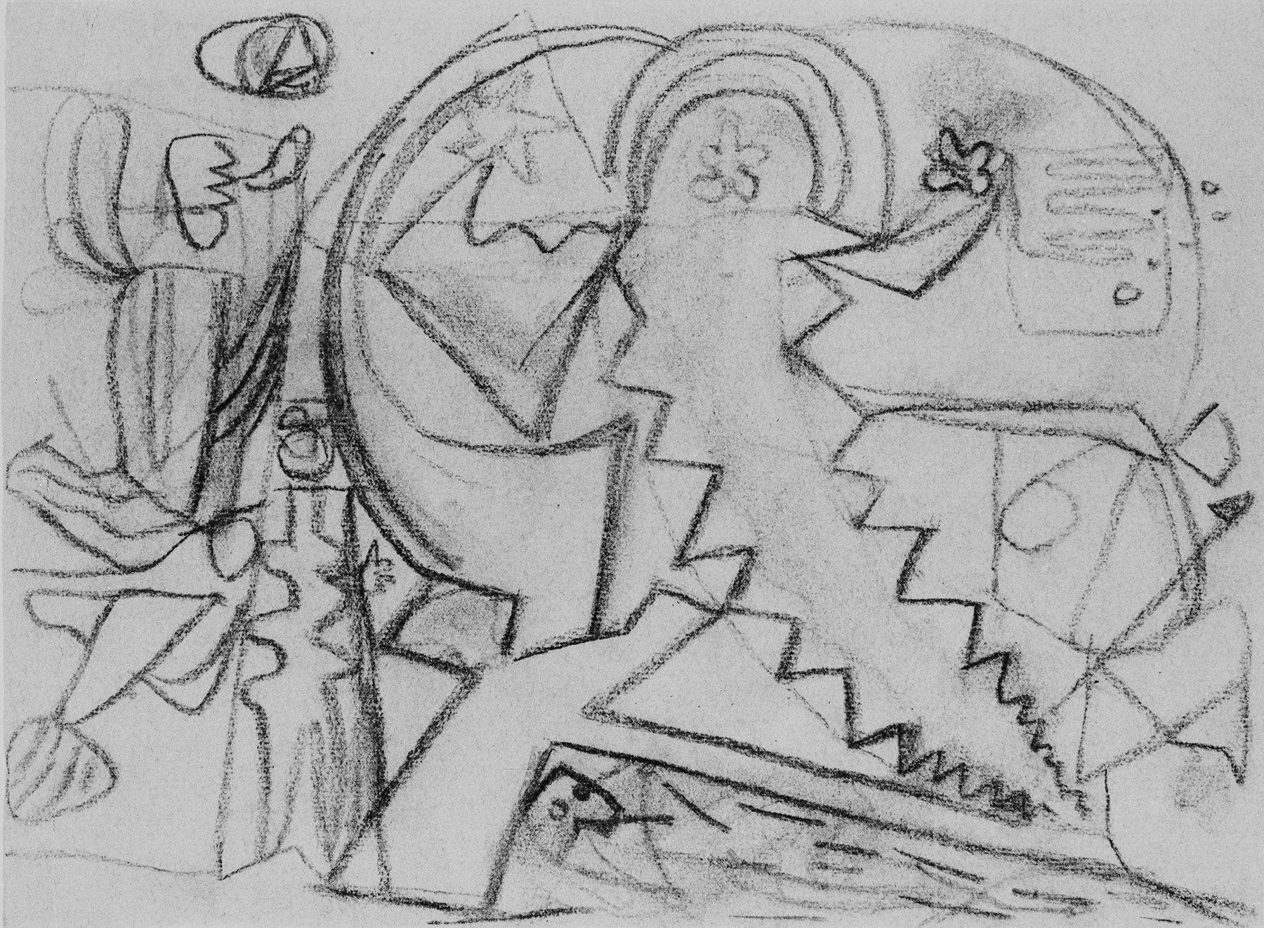 Vgl. das von B. zersägte Gemälde, von dem sich zwei Teile unter G 879 und 880 erhalten haben. Foto des unzerstörten Gemäldes im Archiv Baumeister. (fkb)