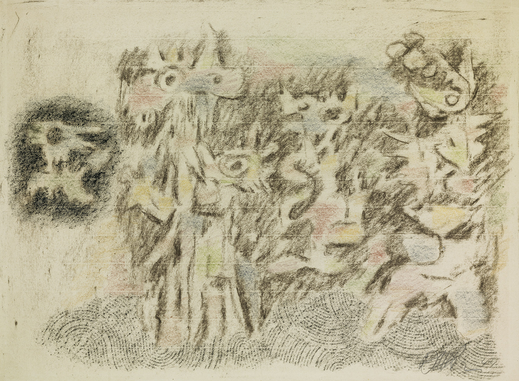 Kohle, z. T. leicht gewischt, Ölkreide in Schwarz, durchgerieben, Rot, Blau, Grün, Gelb, Violett, Braun, fixiert, auf lindgrünem Ingres-Bütten