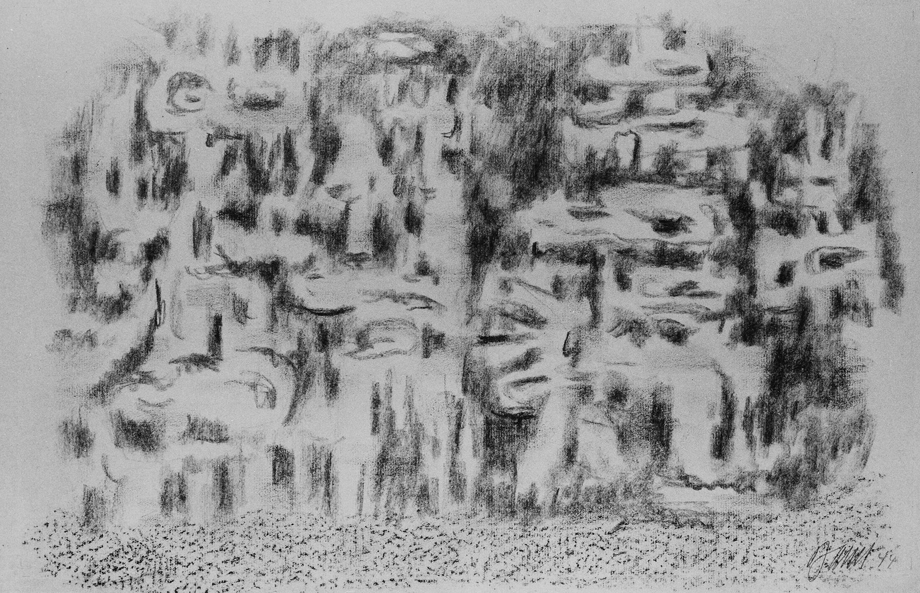 Kohle, z. T. gewischt, radiert, Ölkreide in Blau, Grün, Gelb, Orange, Braun, Ocker, Violett, Schwarz, durchgerieben, fixiert, auf lindgrünem Ingres-Bütten