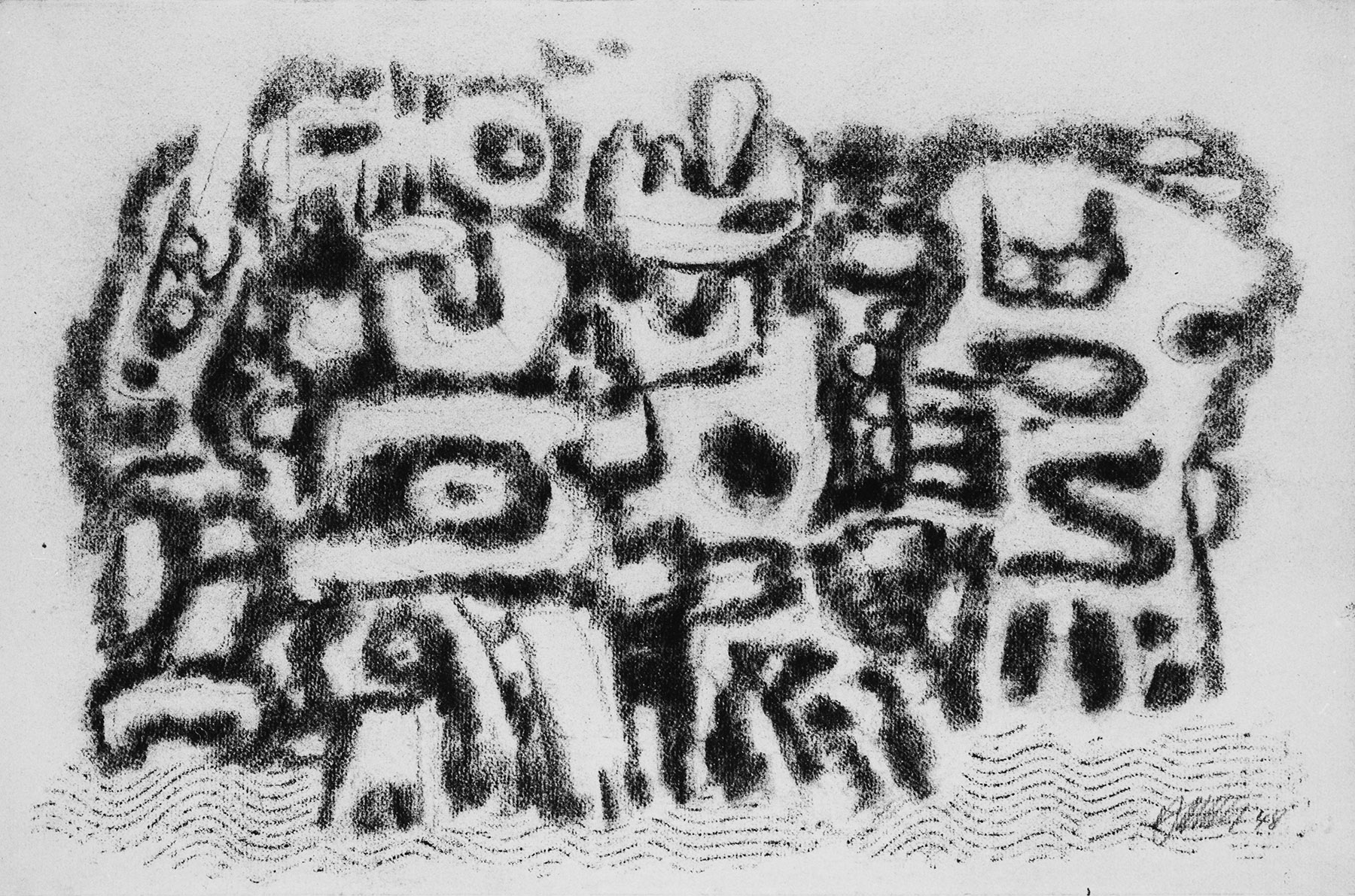 Kohle, gewischt, Ölkreide in Schwarz, durchgerieben, fixiert, auf chamoisfarbigem Ingres-Bütten mit Wz. l. u.: CANSON & MO... und r. o.: INGRES