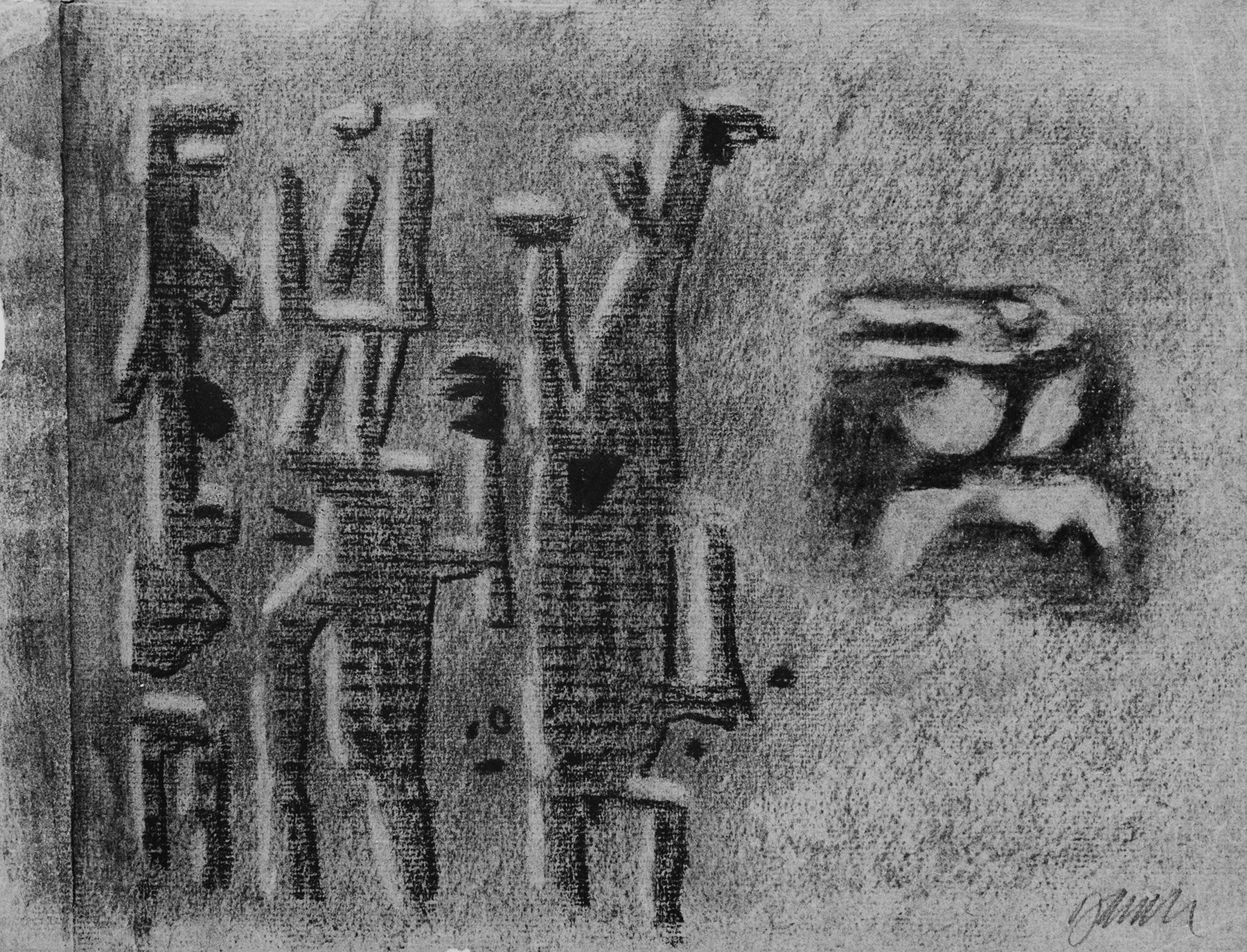 Kohle, gewischt, radiert, Ölkreide in Schwarz, z. T. durchgerieben, Rotbraun, Orange, Blau, fixiert, auf graublauem Ingres-Bütten