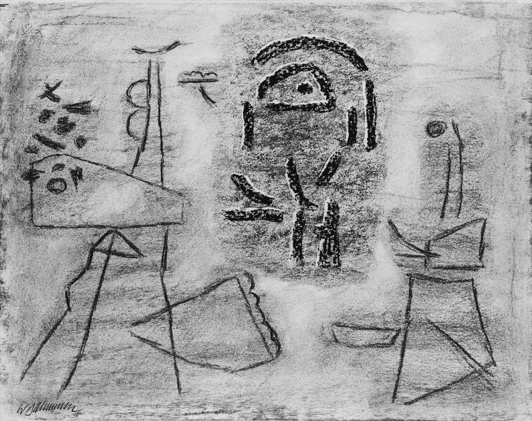 Kohle, gewischt, radiert, Ölkreide in Schwarz, durchgerieben, Pastell in Gelb, Ocker, Blau, Braun, fixiert, auf chamoisfarbigem Zeichenpapier