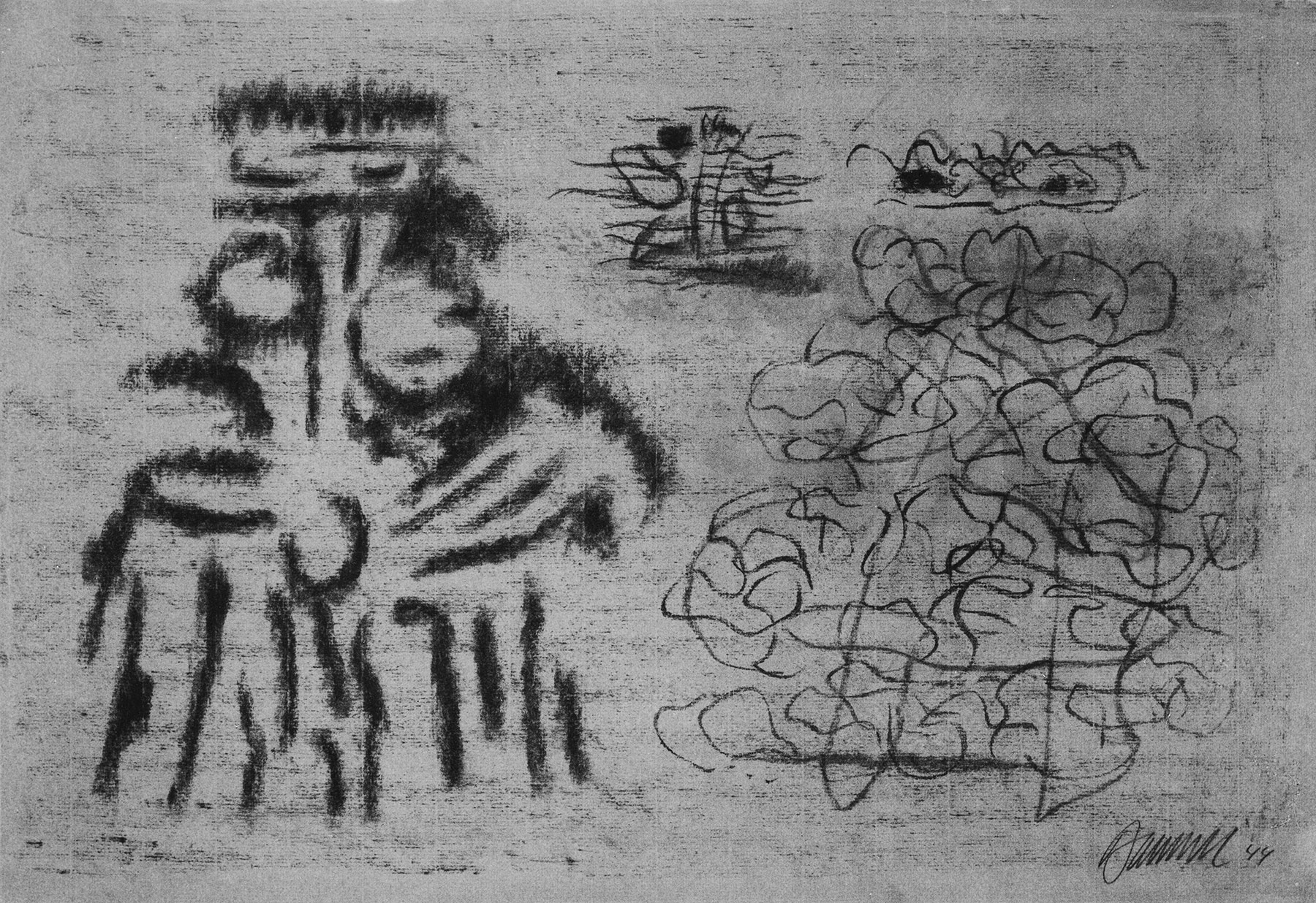 Kohle, gewischt, Pastell in Grün, Blau, Gelb, Rot, laviert, fixiert, auf olivgrünem Ingres-Bütten mit Wz. l. o.: Steigender Löwe im Kreis