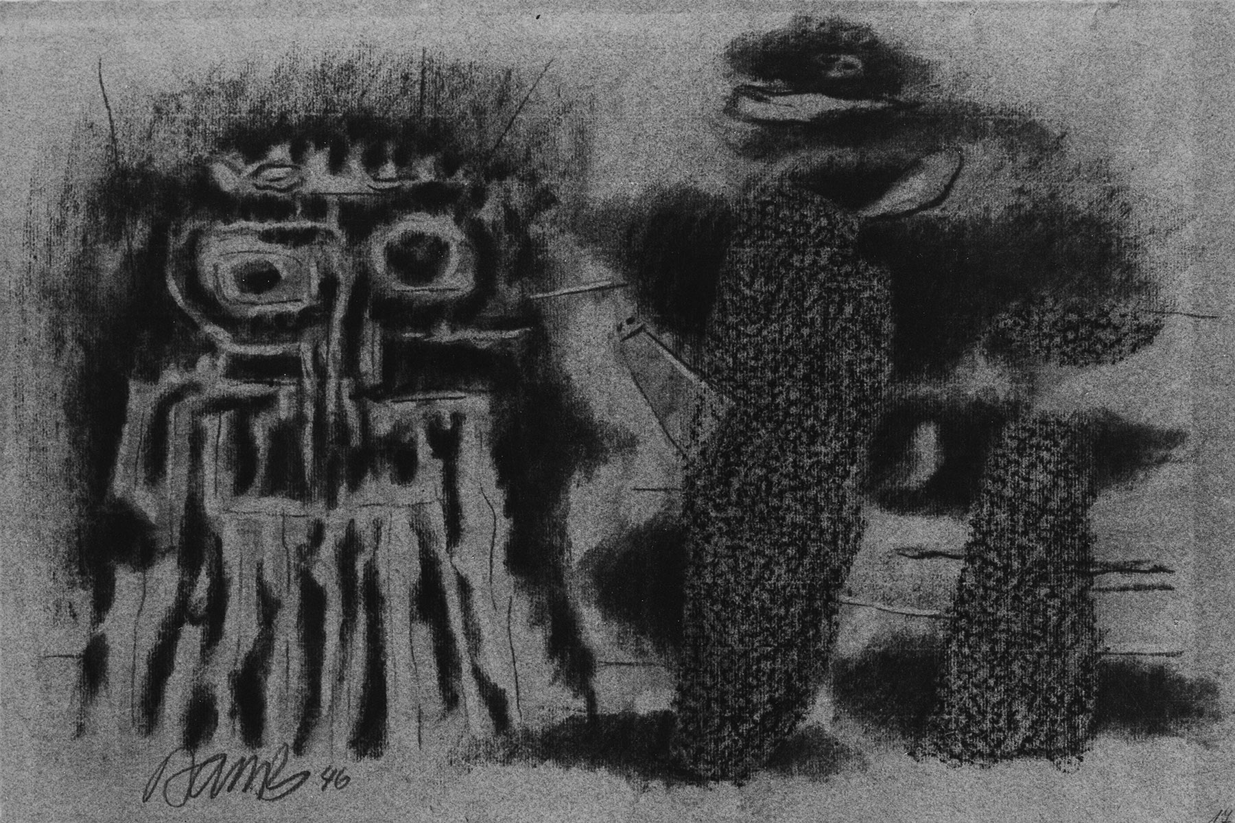 Kohle, gewischt, radiert, Ölkreide in Schwarz, durchgerieben, fixiert, auf blaugrauem Ingres-Bütten mit Wz. l. o.: Hahn im Kreis