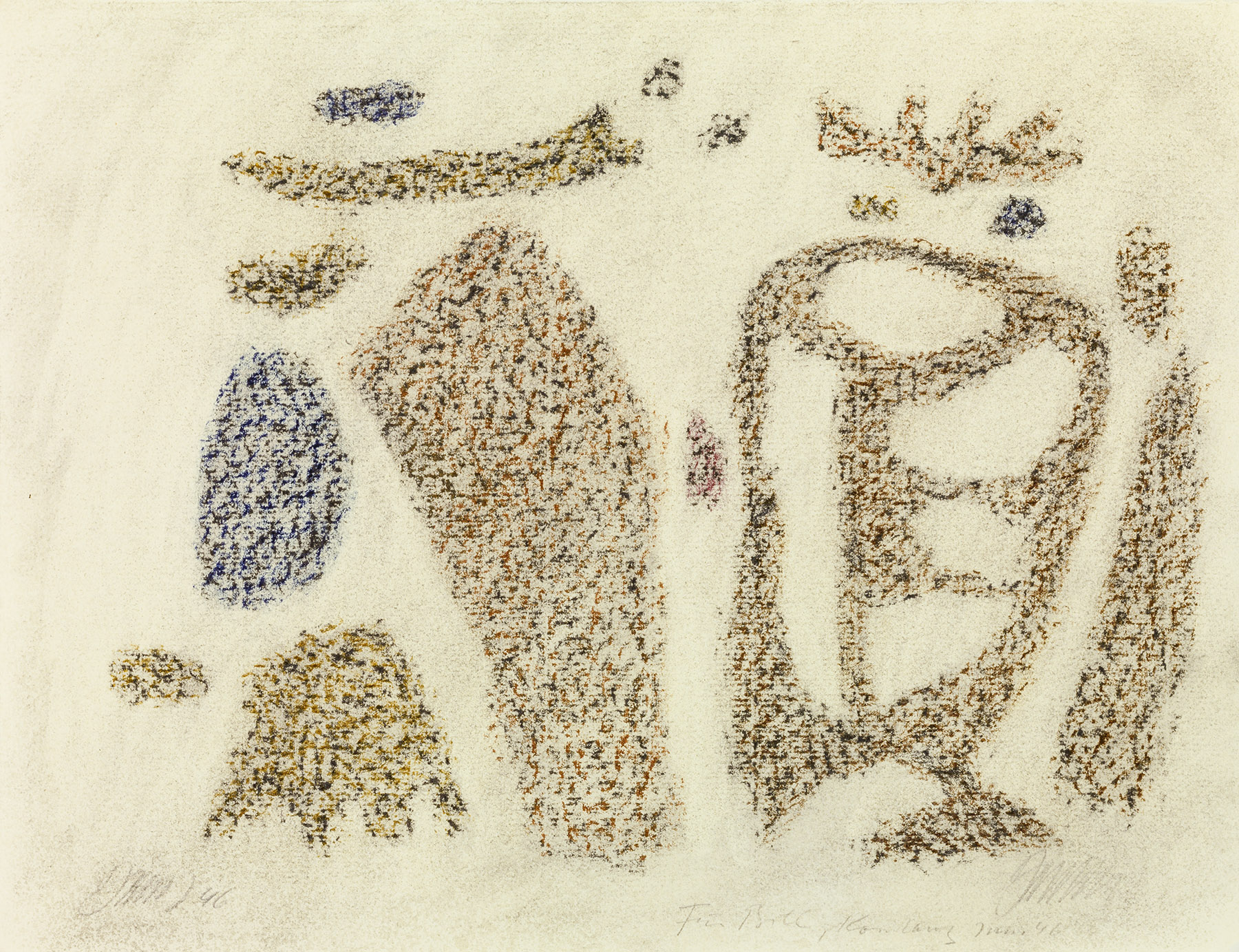 Kohle, Fettkreide in Schwarz, Blau, Braun, Grünlich, Rotbraun, Rotviolett, auf chamoisfarbigem Bütten