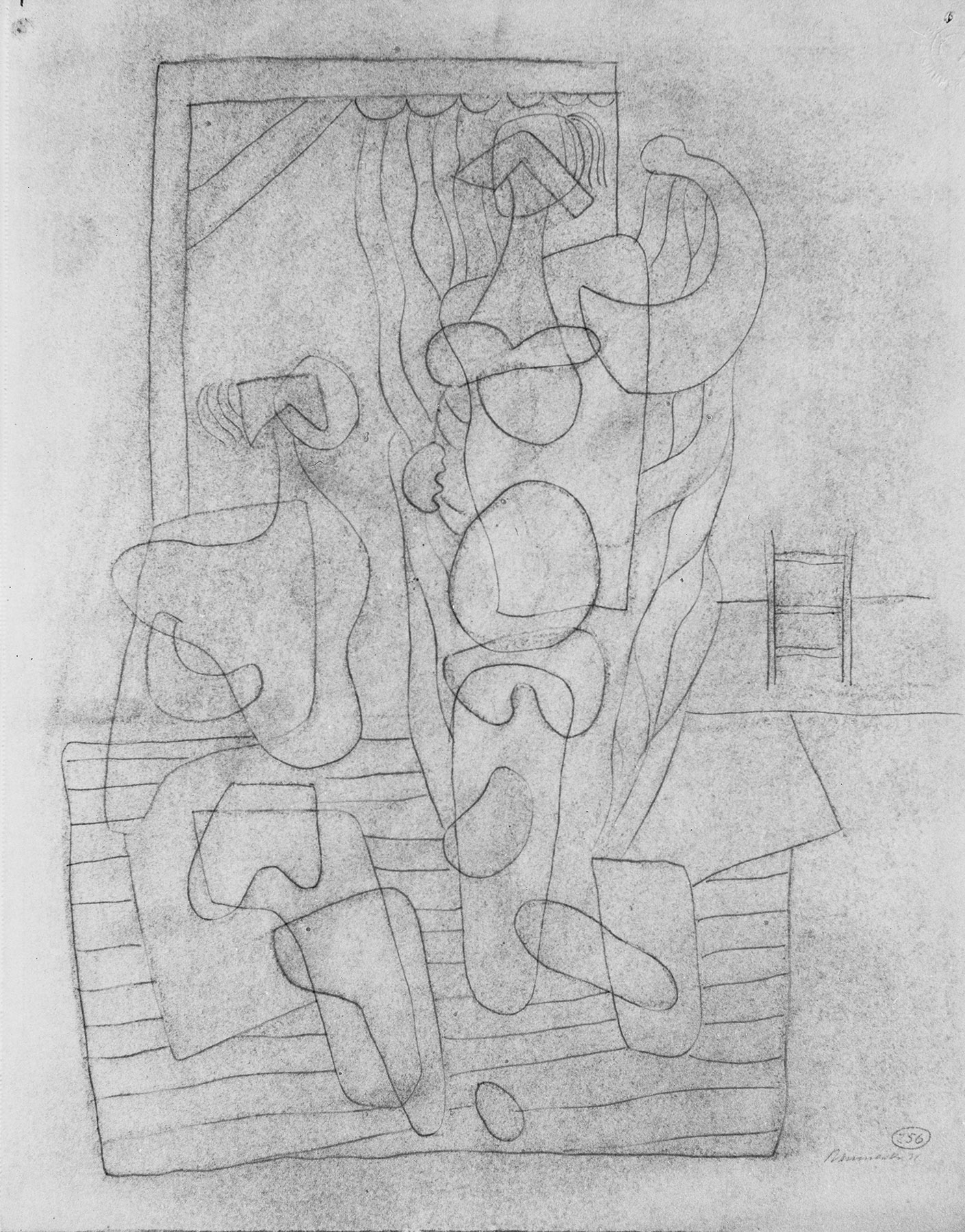 Bleistift, Kohle, gewischt, über Skizze in Kohle, Konturen mit hartem Bleistift vorgeritzt, fixiert, auf chamoisfarbigem, am Rand l. perforiertem Zeichenkarton, Prägestempel Ecke r. o.: SCHOELLERSHAMMER (angeschnitten)
