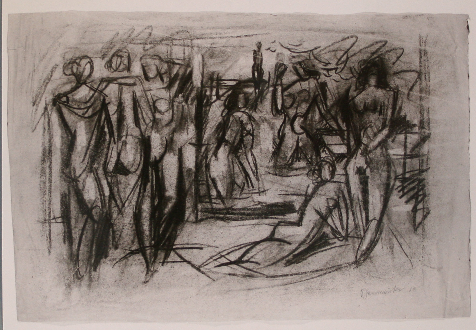 Dieses Blatt aus einer umfangreichen Gruppe mit den Nr. 25-34 ist als einziges datiert. Das Thema der arkadisch-bukolischen Komposition ist der weibliche Körper in Verbindung mit Wasser und Landschaft, offensichtlich angeregt durch die Bilder Cézannes, die B. 1911 in Paris gesehen hat. Das vorliegende Blatt gibt eine der ausführlichsten und raumhaltigsten Kompositionen wieder.