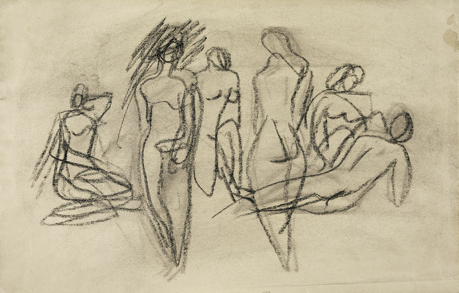 Kohle, gewischt, schwarze Ölkreide, fixiert, auf beigefarbigem Ingres-Bütten mit Wz. r. o.: INGRES