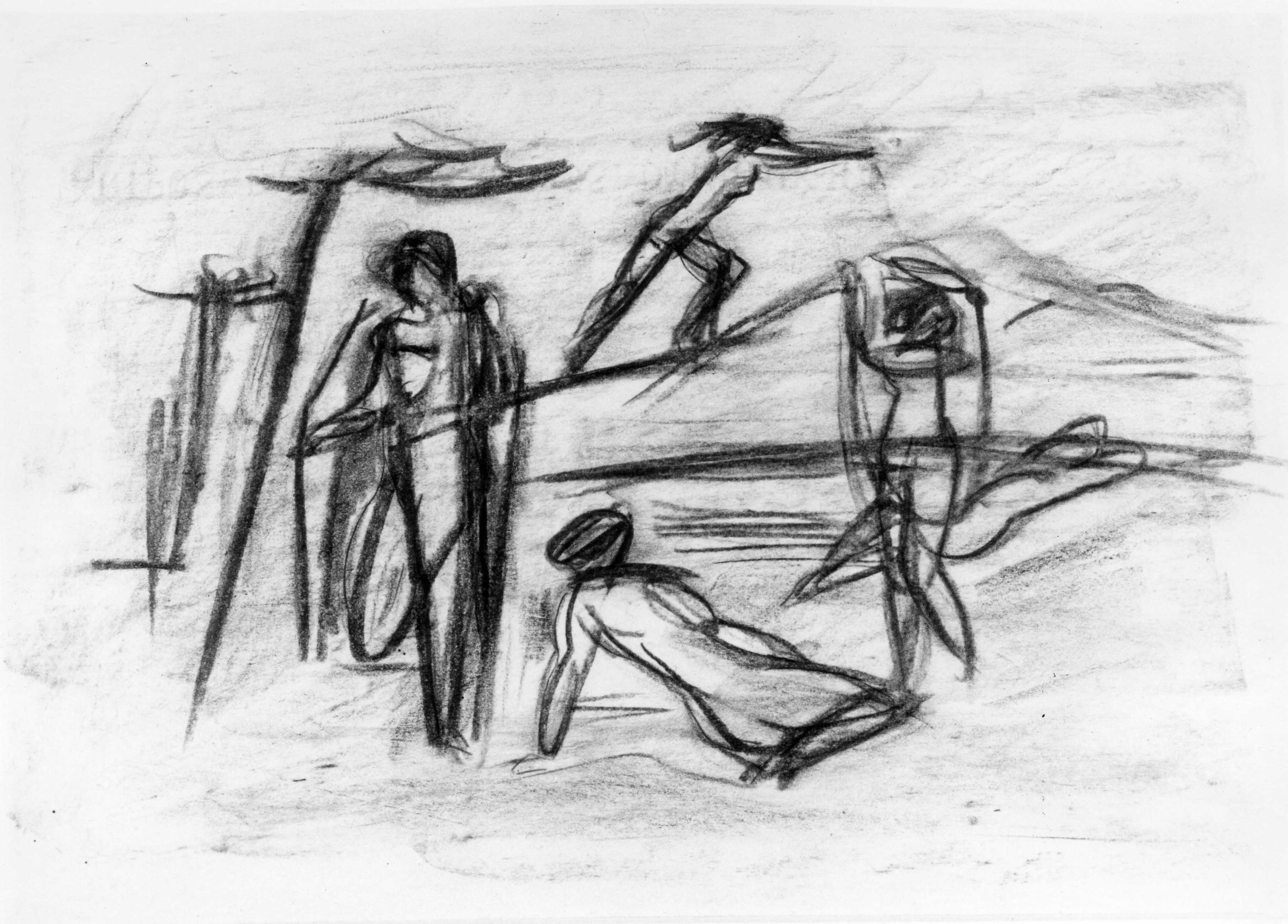 Kohle, gewischt, Ölkreide in Violett, Braun, Gelb, fixiert, auf chamoisfarbigem, durchscheinendem Schreibpapier mit Wz. o.: DYNAMIK-HARTPOST