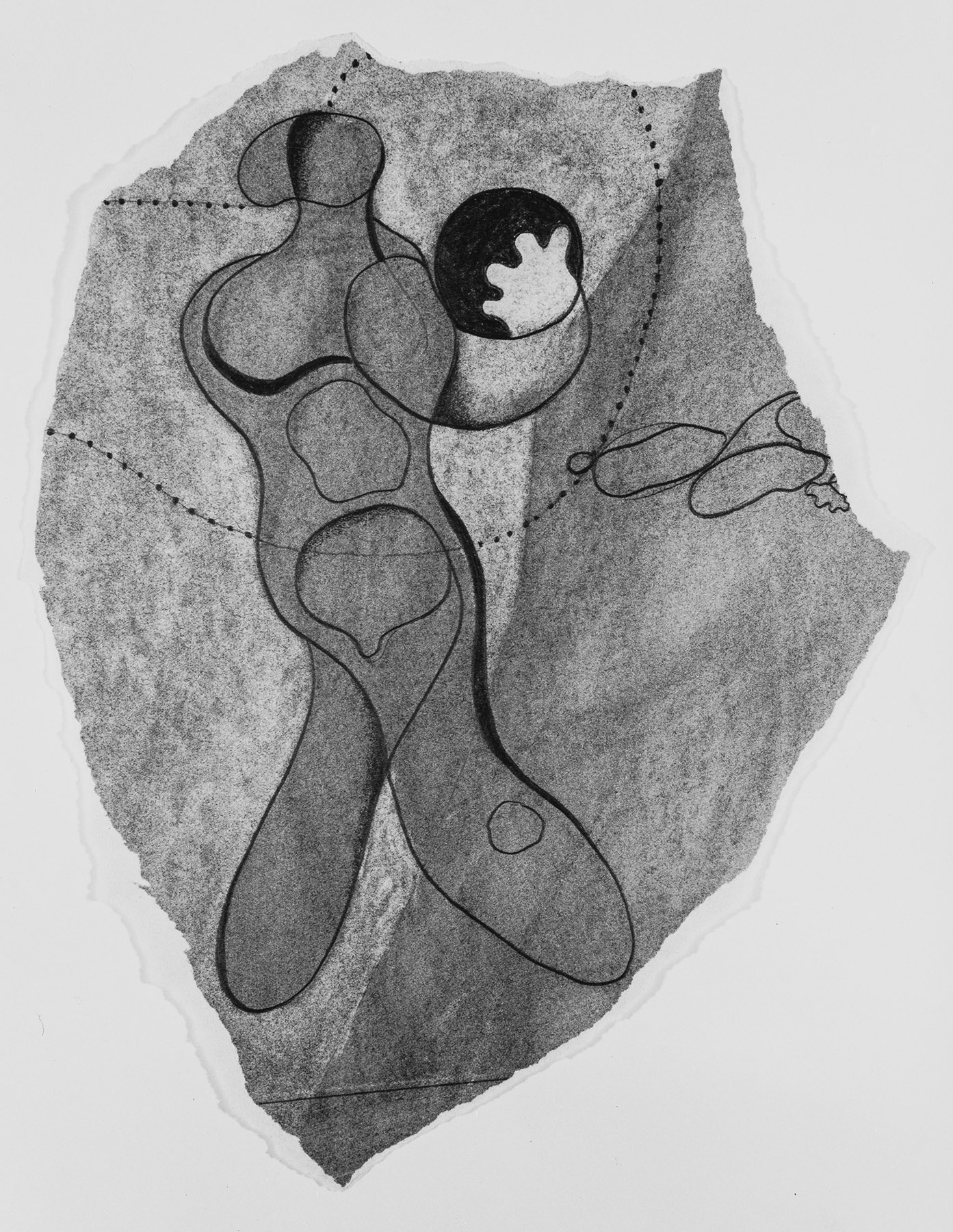 Kohle, gewischt, Bleistift, Konturen z. T. stark eingedrückt (oder vorgeritzt mit Abweichungen), fixiert, Teil einer Einfassungslinie u., auf chamoisfarbigem Zeichenkarton, die Ränder in unregelmäßiger Form zugerissen