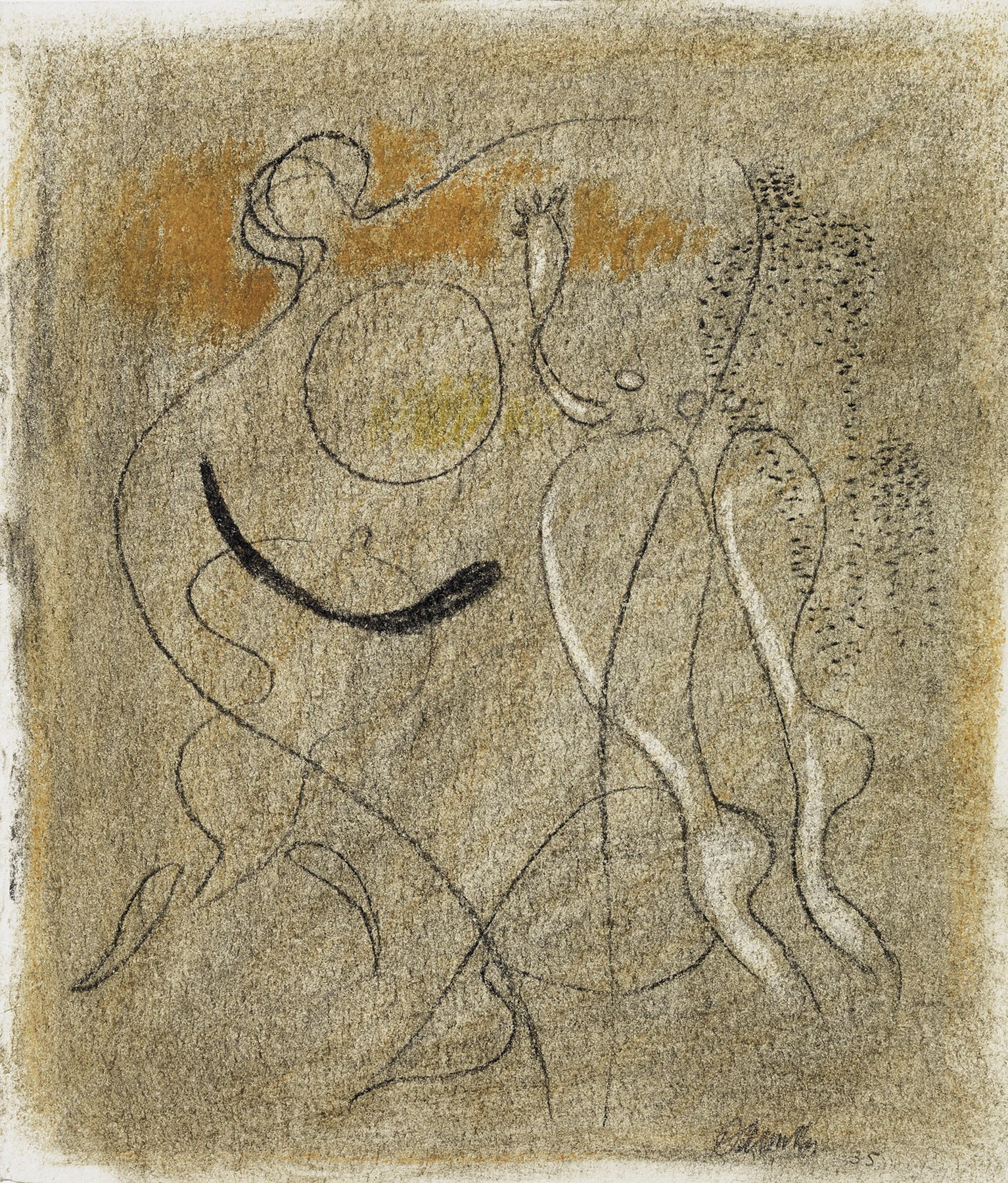 Kohle, gewischt, radiert, Pastell in Gelb, Ocker, fixiert auf chamoisfarbigem, am Rand u. und l. im scharfen Knick gerissenem Aquarellkarton