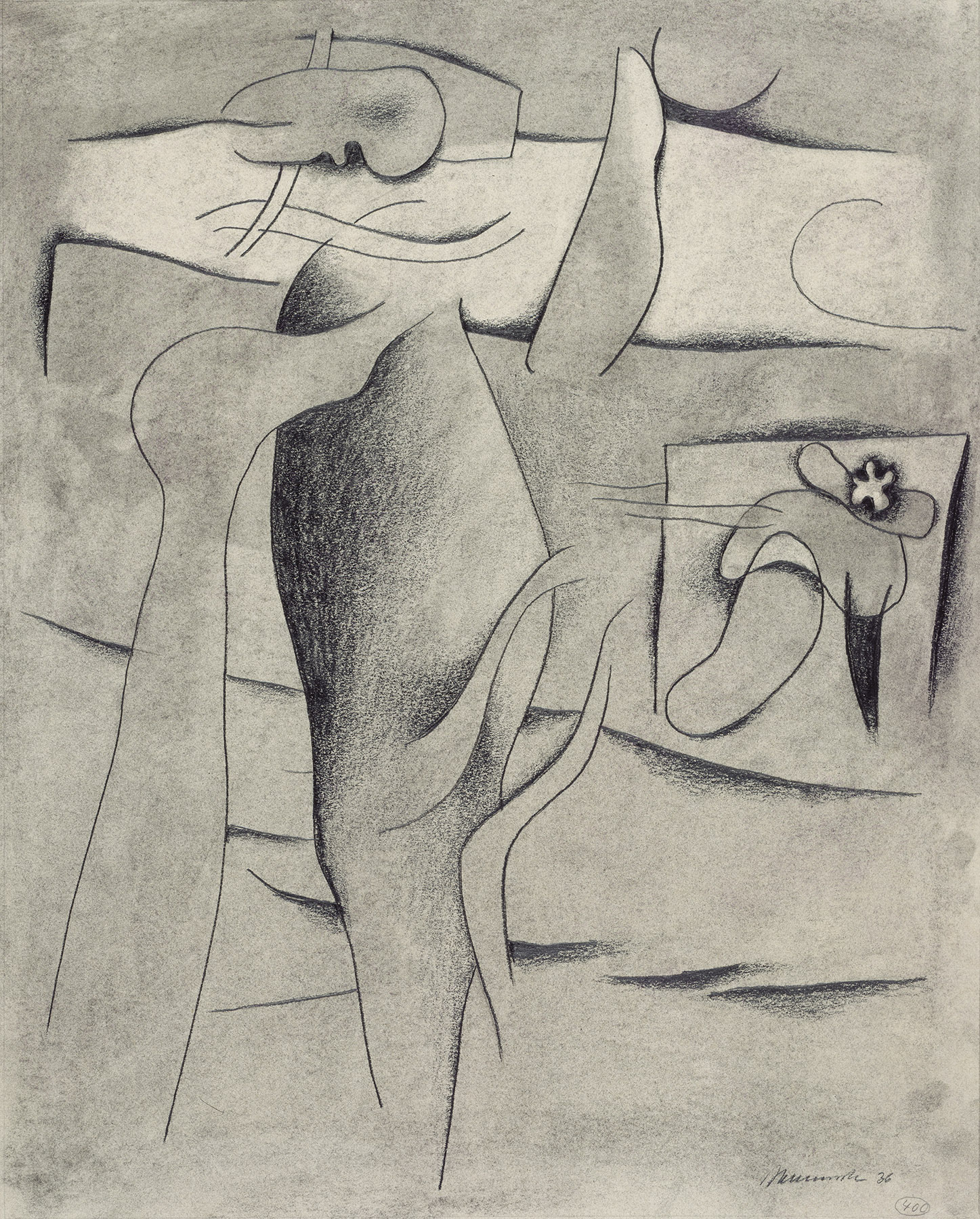 Bleistift, Kohle, gewischt, fixiert, Konturen mit hartem Bleistift vorgeritzt, Einfassungslinien, auf chamoisfarbigem, am Rand r. perforiertem Zeichenkarton
