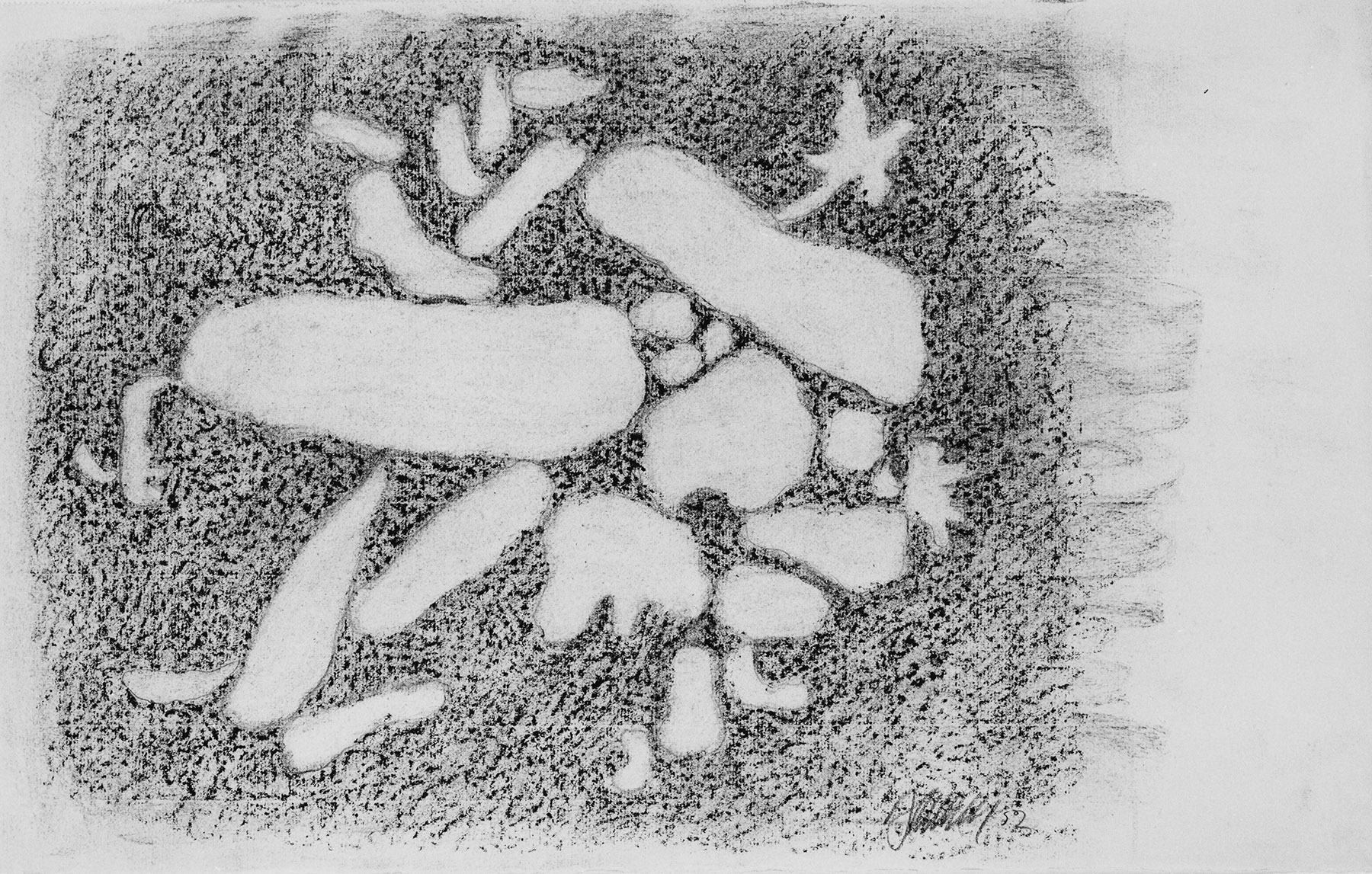 Kohle, gewischt, Ölkreide in Schwarz, durchgerieben, fixiert, auf chamoisfarbigem, am Rand o. perforiertem Ingres-Bütten