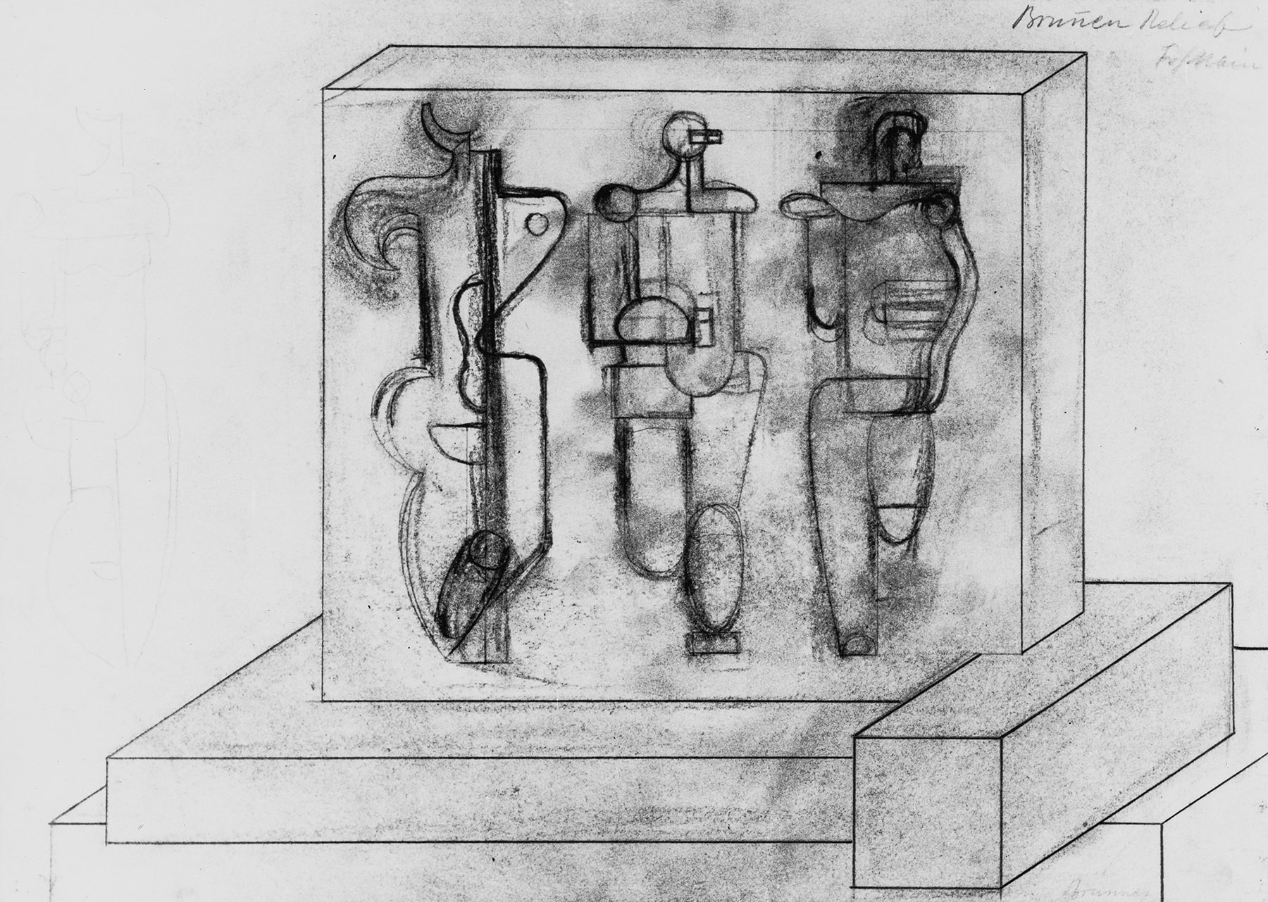 Kohle und Bleistift, gewischt und fixiert, unter Verwendung des Lineals, Skizze in Kohle (mit Abweichungen), Linien und Kurven z. T. mit hartem Bleistift ein- oder vorgeritzt, auf chamoisfarbigem, am Rand o., r. und u. perforiertem Zeichenkarton