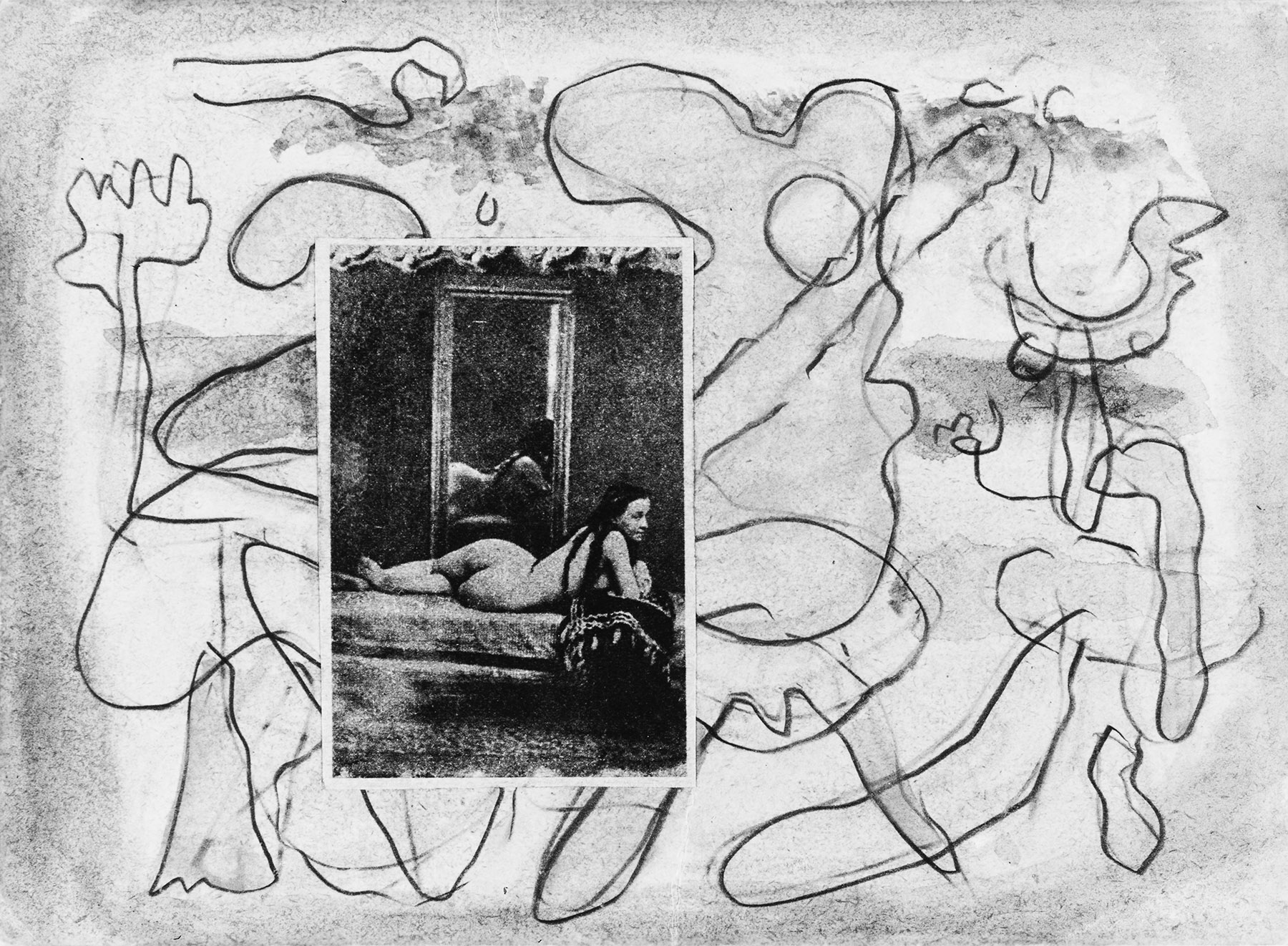 Kohle, gewischt, Bleistift, Pauskonturen, Collage mit reproduziertem Foto, Aquarell in Violett, Rot, Blau, Gelb, Grün, auf chamoisfarbigem, dünnem, geglättetem Karton