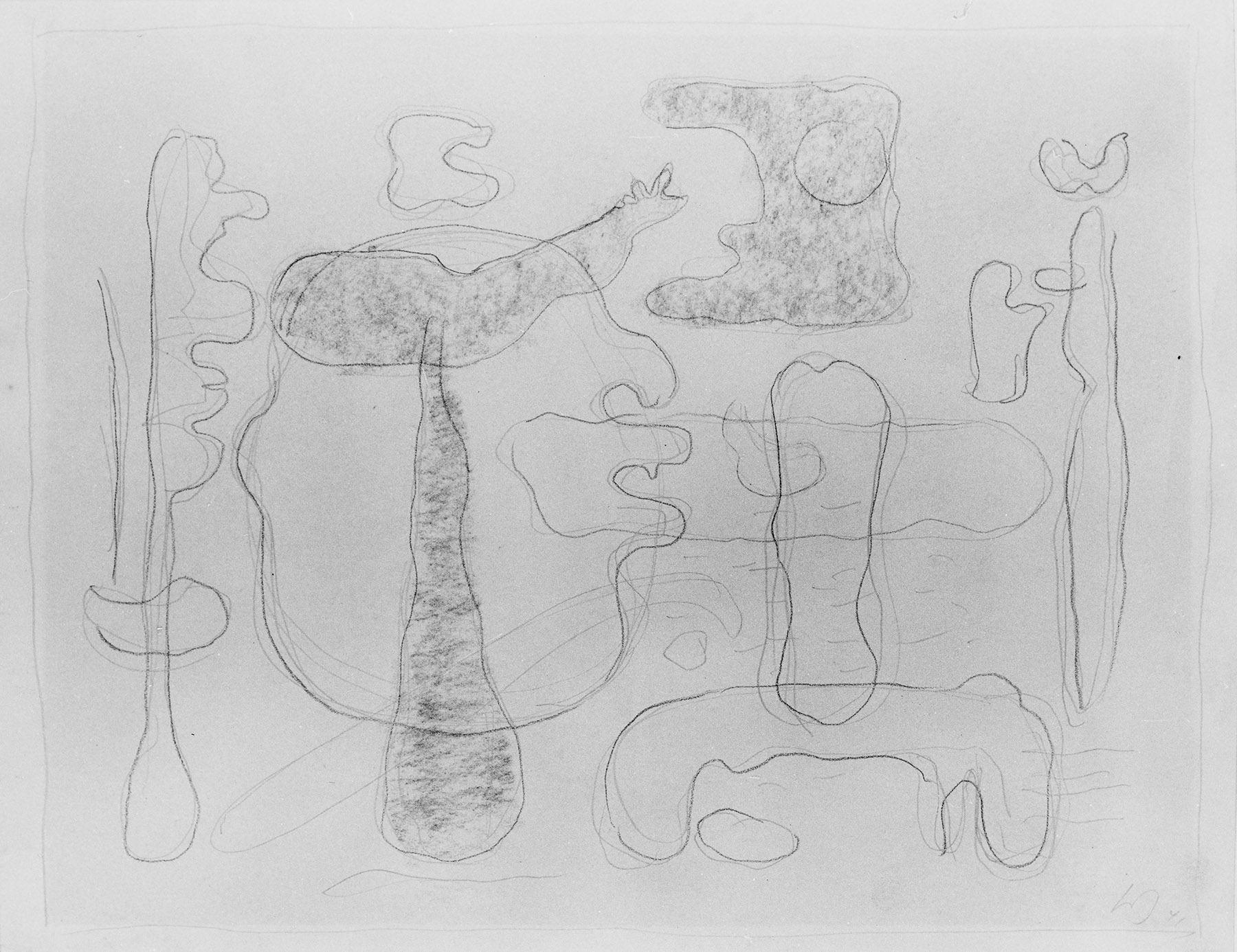 Kohle, Bleistift, Farbstift in Rot, Violett, Blau, fixiert, Einfassungslinien, auf chamoisfarbigem Zeichenpapier