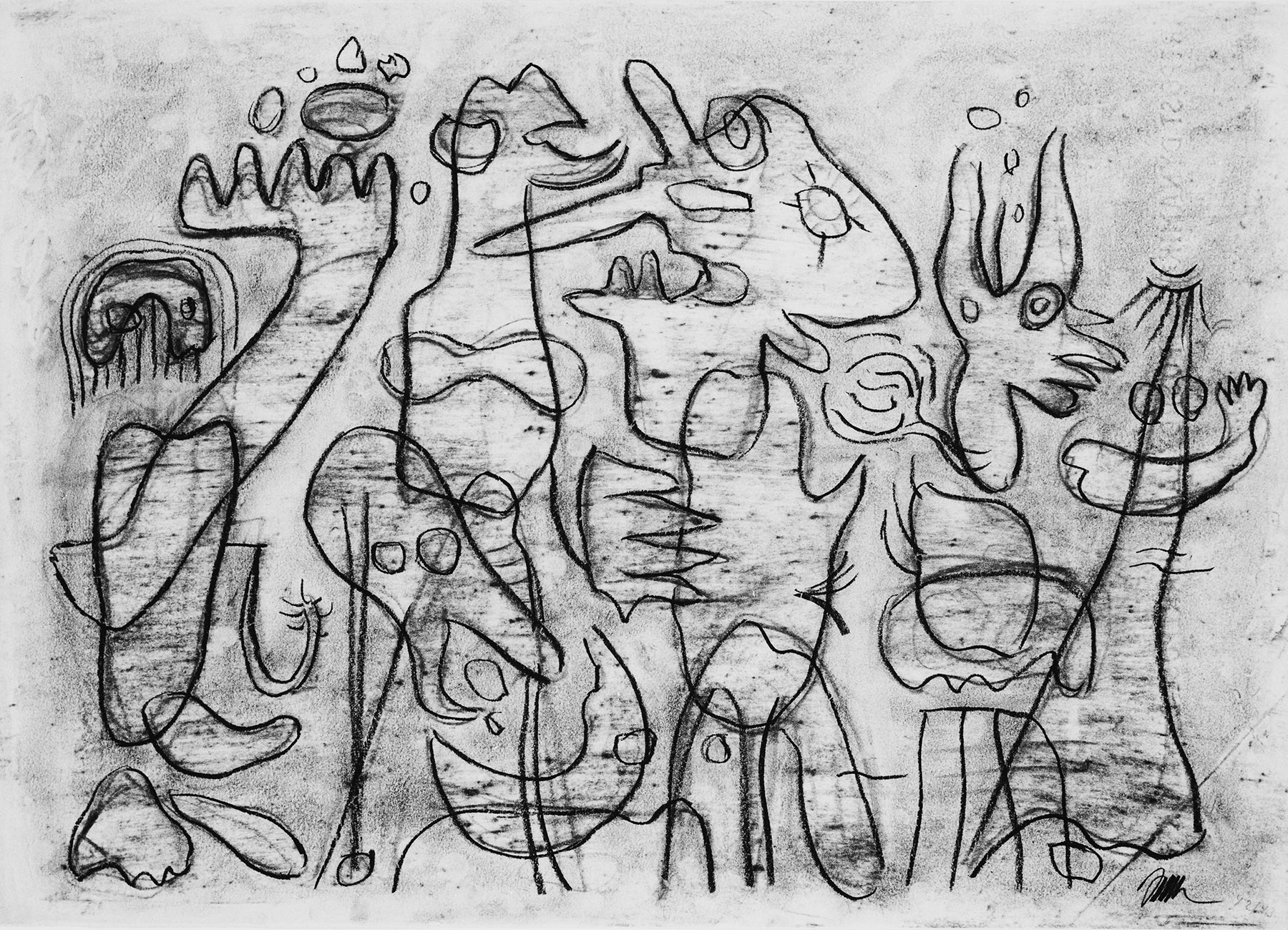 Kohle, gewischt, Ölkreide in Schwarz, fixiert, auf chamoisfarbigem, durchscheinendem Schreibpapier mit Wz. r. und l.: DYNAMIK. HARTPOST