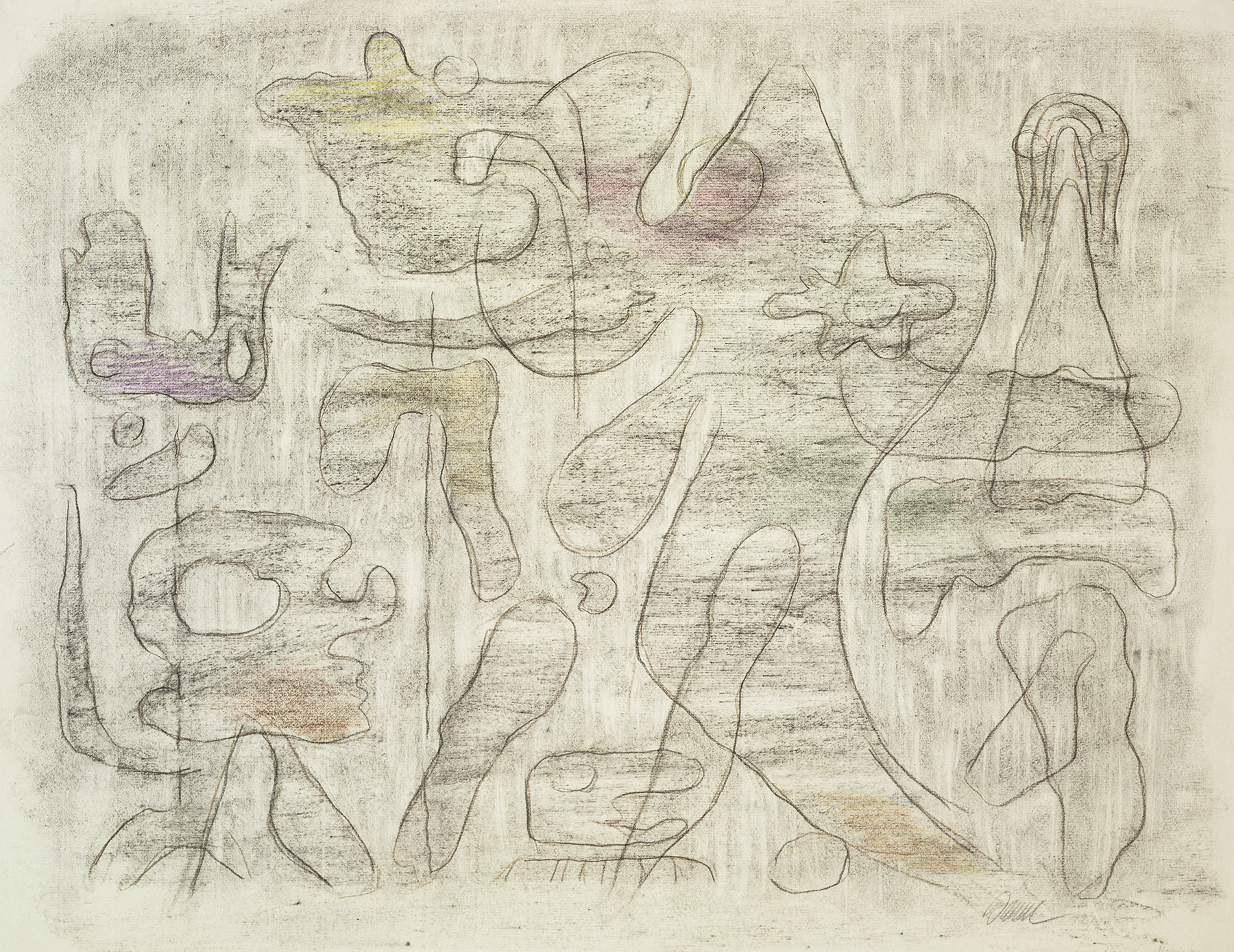Kohle, gewischt, radiert, Ölkreide in Schwarz, Braun, Orange, Rot, Violett, Ocker, Gelb, Grün, fixiert, auf chamoisfarbigem Ingres-Bütten mit Wz. r. u.: INGRES und l. u.: Hahn im Kreis