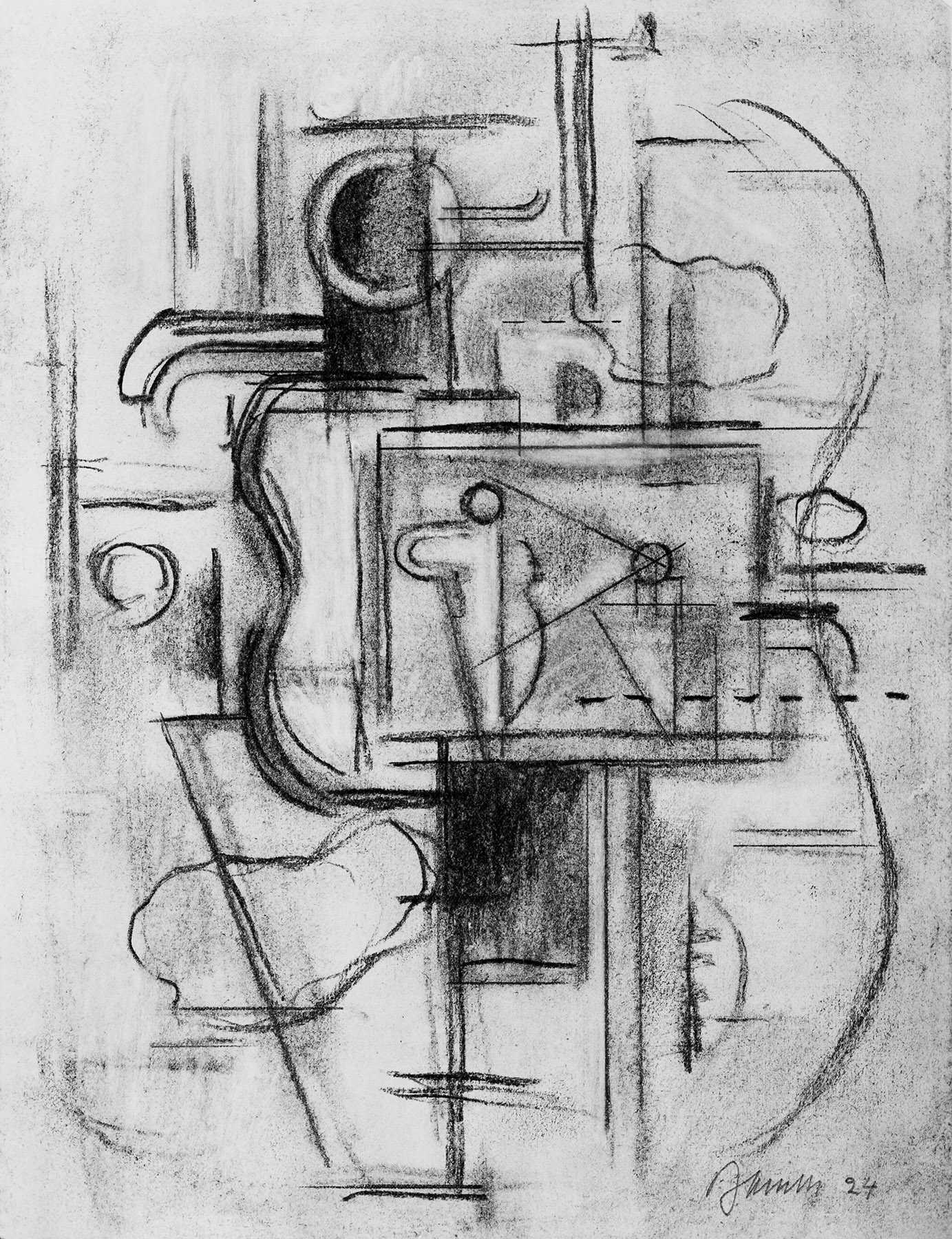 Kohle, z. T. gewischt, Bleistift, unter Verwendung des Lineals, Pastellkreide in Gelb, Rot, Blau, Weiß, fixiert, auf gelblichem, holzhaltigem Zeichenpapier, am Rand u. aus der Heftung unregelmäßig gerissen