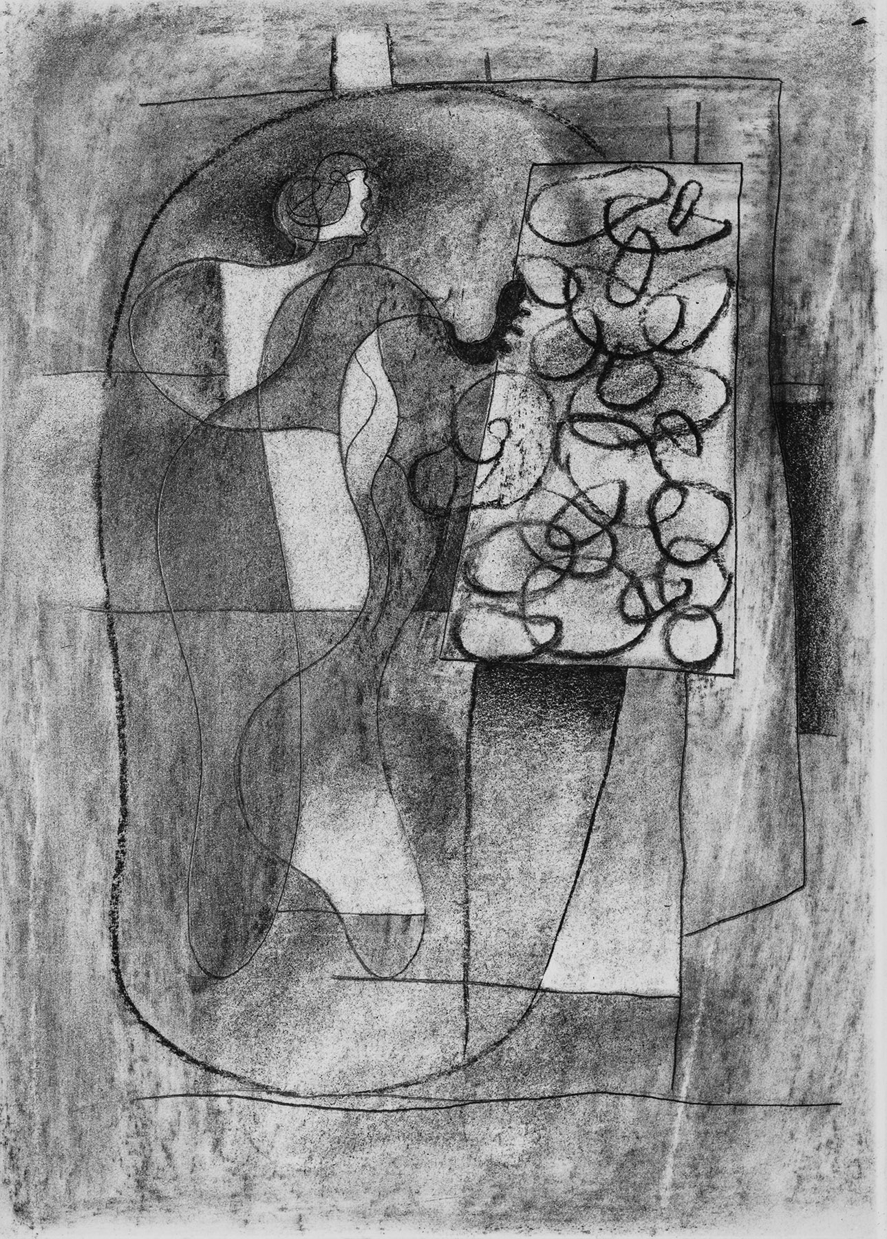 Kohle, gewischt, Bleistift, Ritzkonturen, Ölkreide in Rot, Grün, Orange, Gelb, fixiert, auf chamoisfarbigem Zeichenkarton