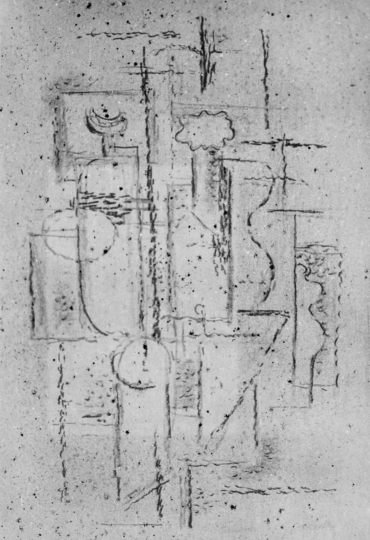 Schwarze und farbige Kreiden, auf gespritztem Grund mit schablonierter Aussparung, auf glattem Zeichenpapier