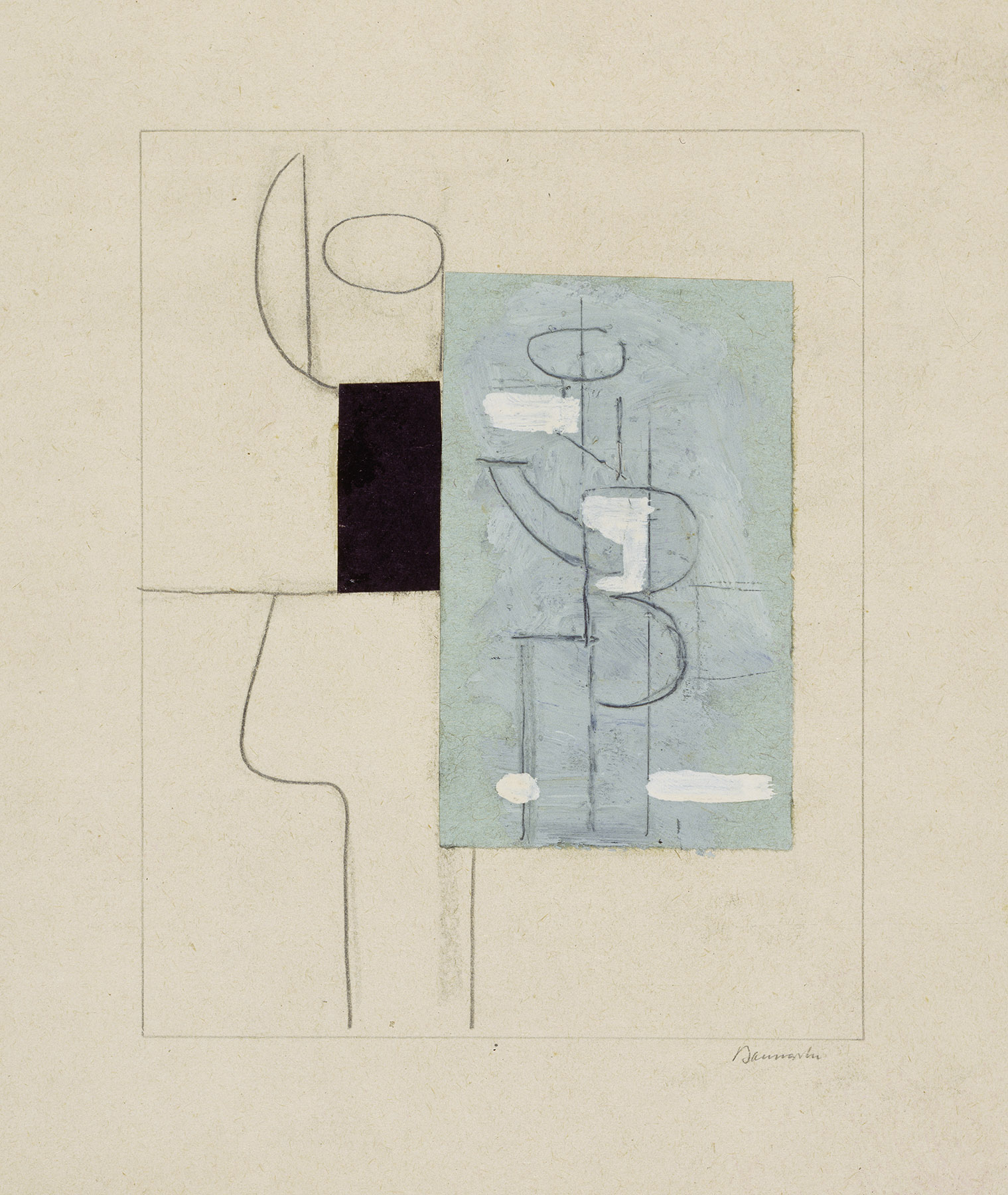Kohleskizze, Bleistift, Collage mit schwarzem Fotokarton und türkisfarbigem Maschinen-Bütten, Deckfarbe, pastös, in Türkis und Weiß, mit Bleistift in die feuchte Farbe geritzt, Einfassungslinien auf beigefarbiger, rückseitig kaschierter Holzpappe