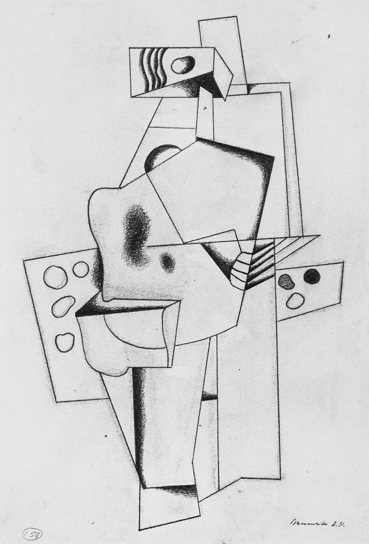 Bleistift, unter Verwendung des Lineals, Kohle, gewischt, über Skizze in Kohle, Konturen z. T. blind vorgeritzt, fixiert, Einfassungslinien, auf chamoisfarbigem, am Rand l. perforiertem Zeichenkarton